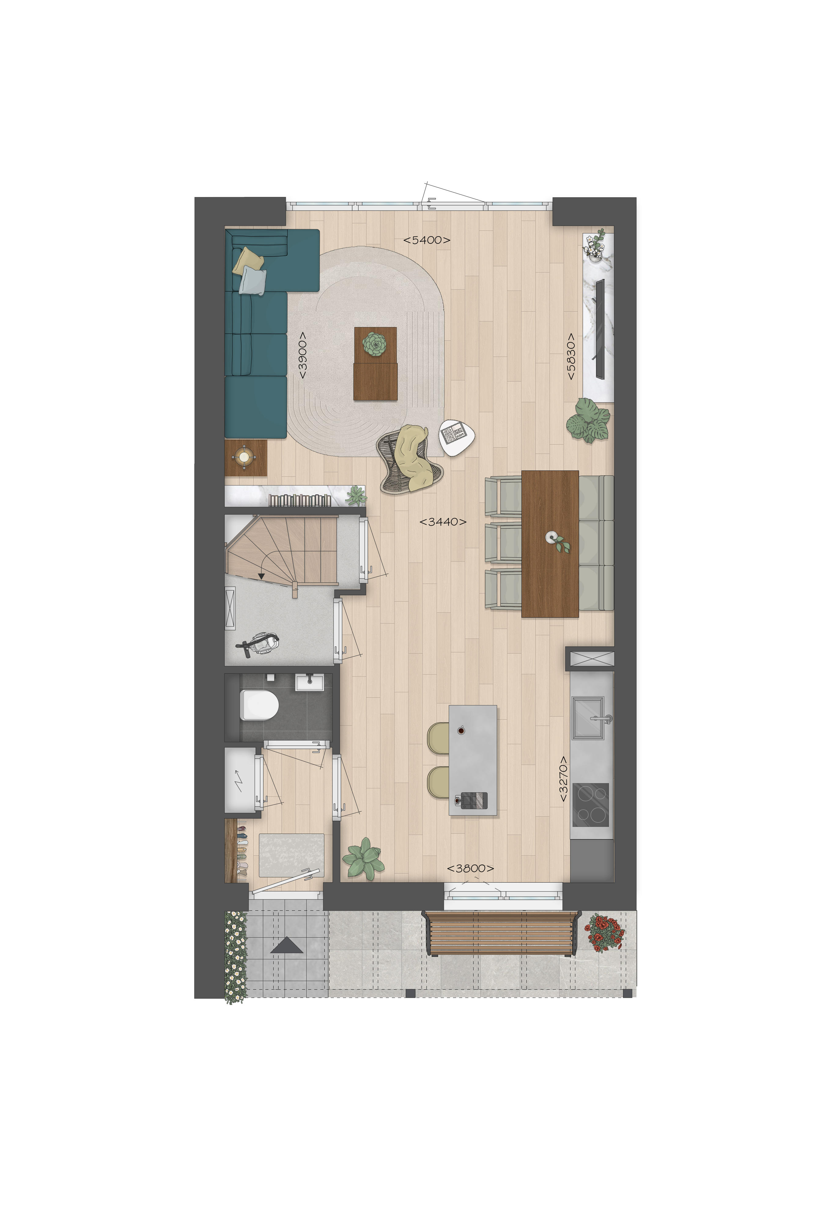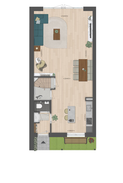 De indeling is bijzonder praktisch met beneden een compacte hal met kastruimte en toilet, een lichte tuingerichte woonkamer en een open keuken met zicht op de straat. TIP: Maak de woonkamer nóg groter met de optie om deze met 1.20m of 2.40m uit te breiden. De optie voor openslaande tuindeuren zorgen voor veel contact met de achtertuin.