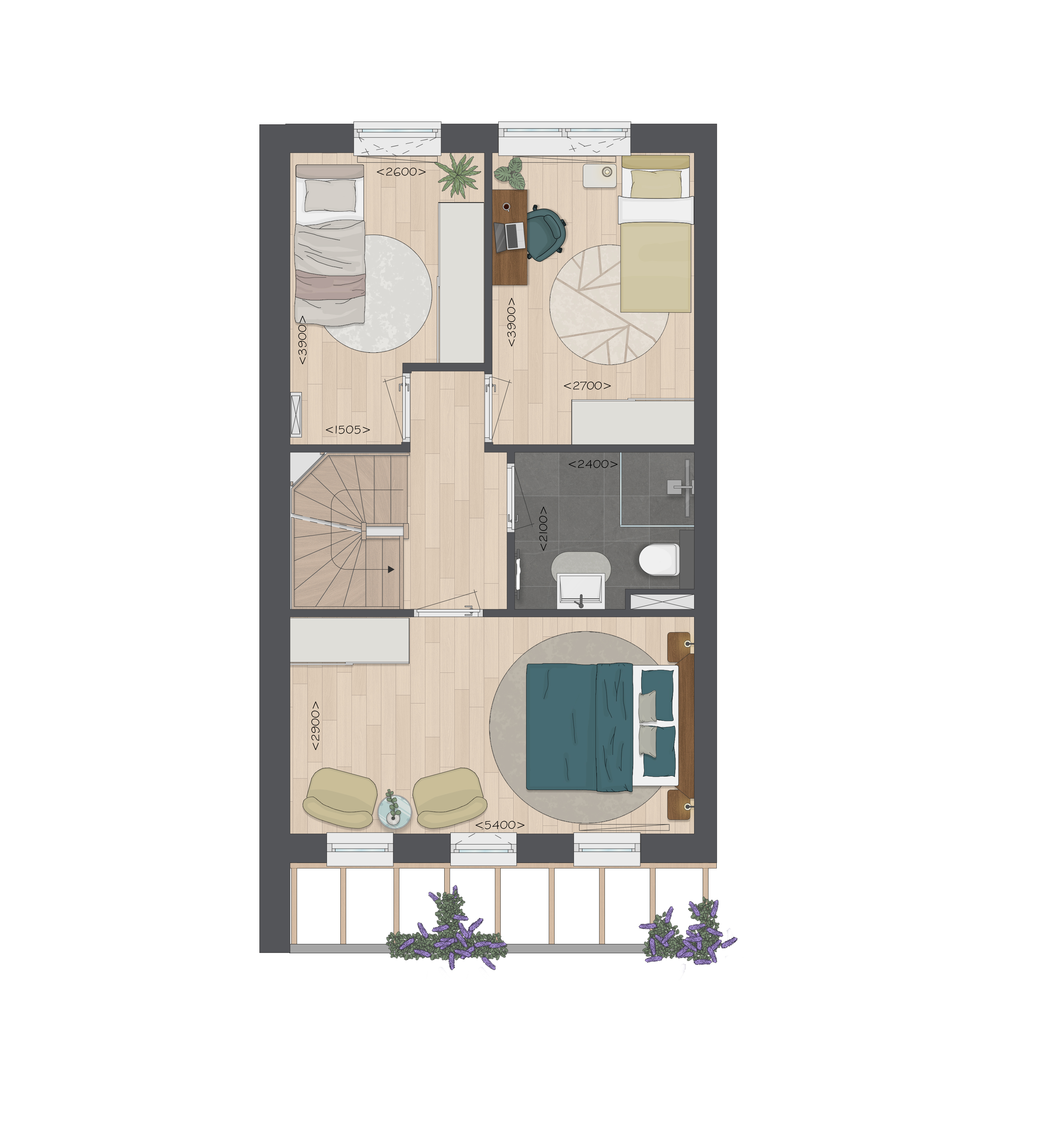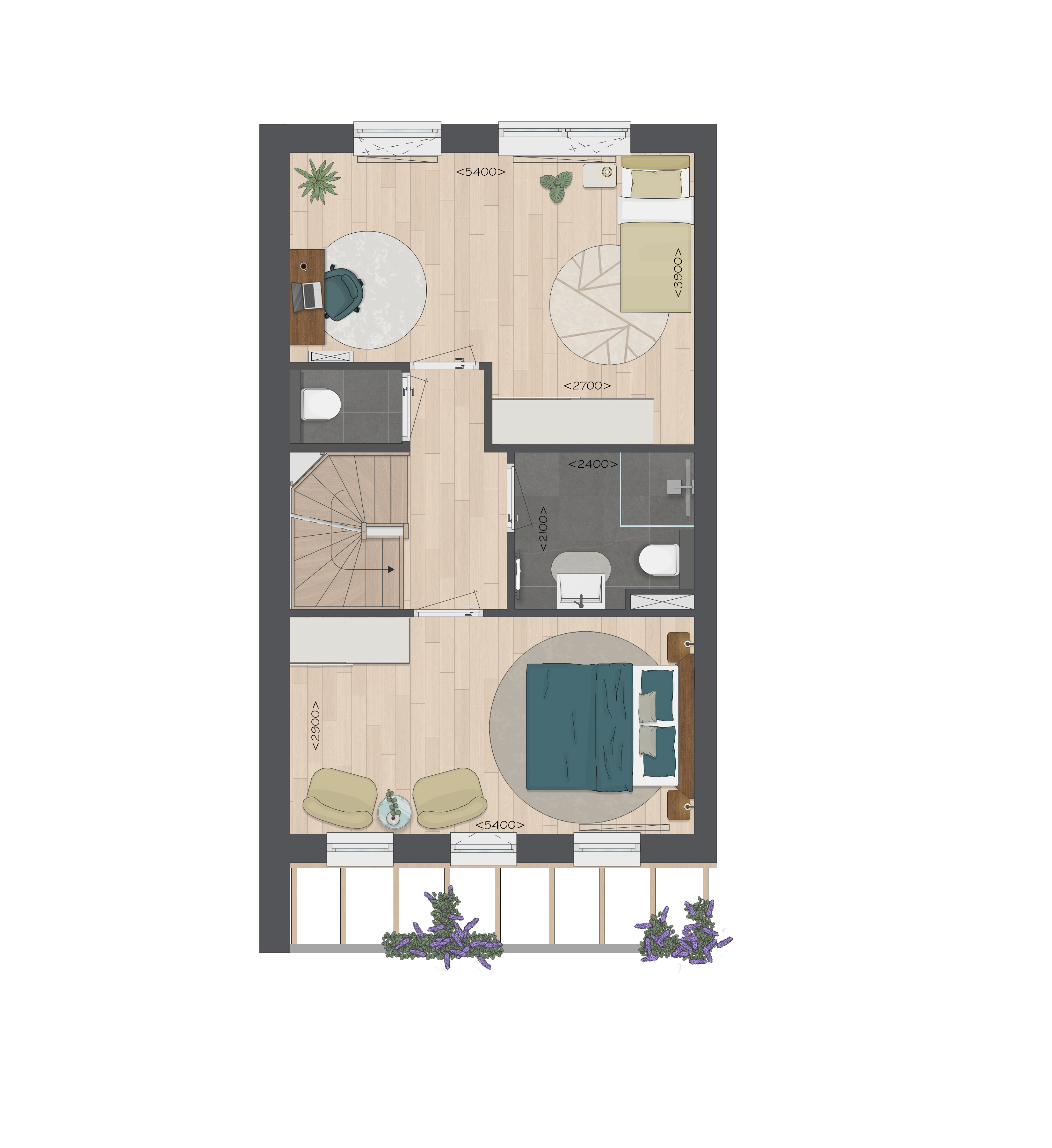 Op de verdieping vind je drie slaapkamers (waarvan 1 over de volledige breedte van het huis) en een complete badkamer met douche, wastafel en 2e toilet. Creëer meer ruimte in de badkamer door te kiezen voor een apart toilet op deze verdieping. Je kunt bijvoorbeeld ook de 2 slaapkamers aan de achterzijde samenvoegen tot één grote hoofdslaapkamer.