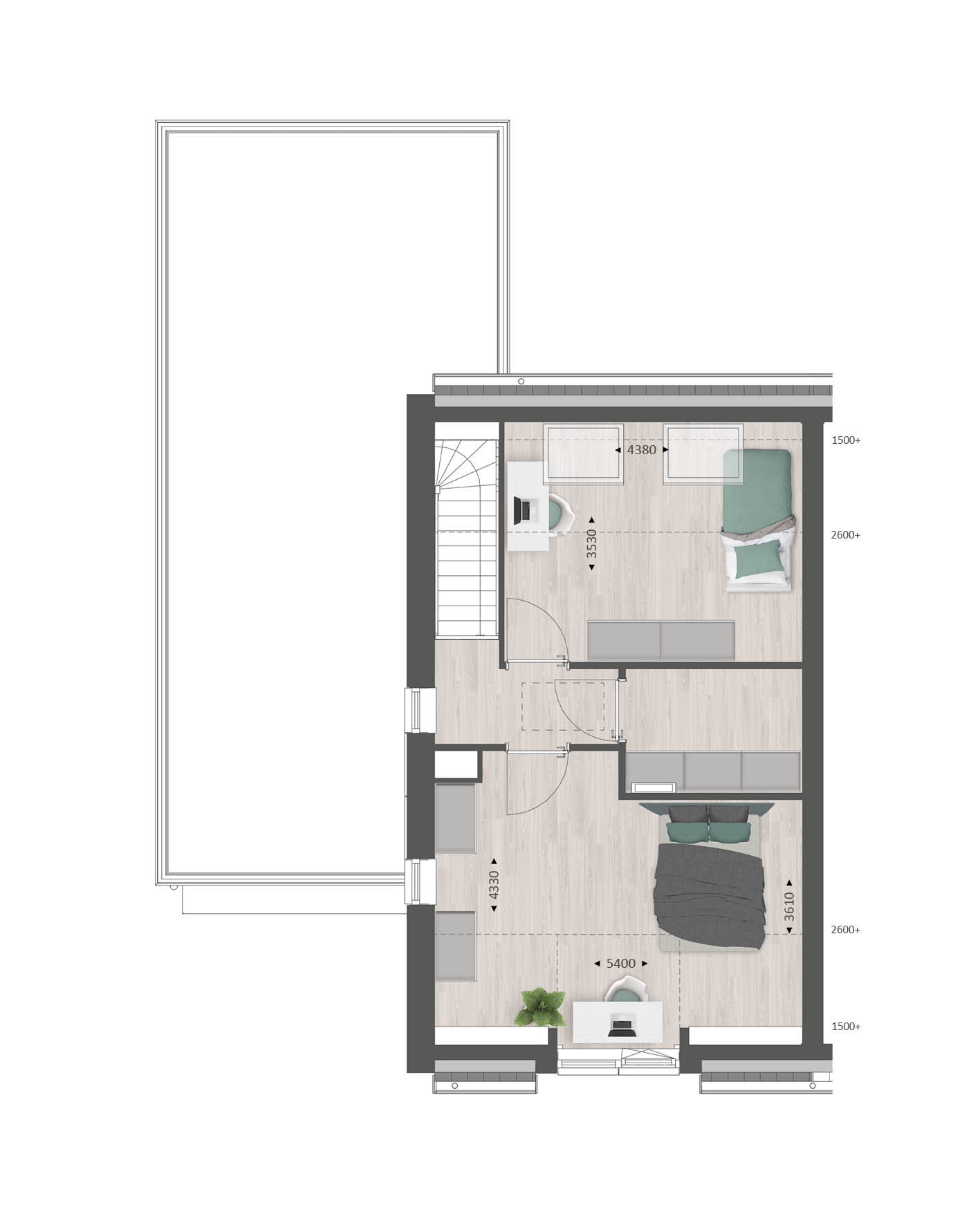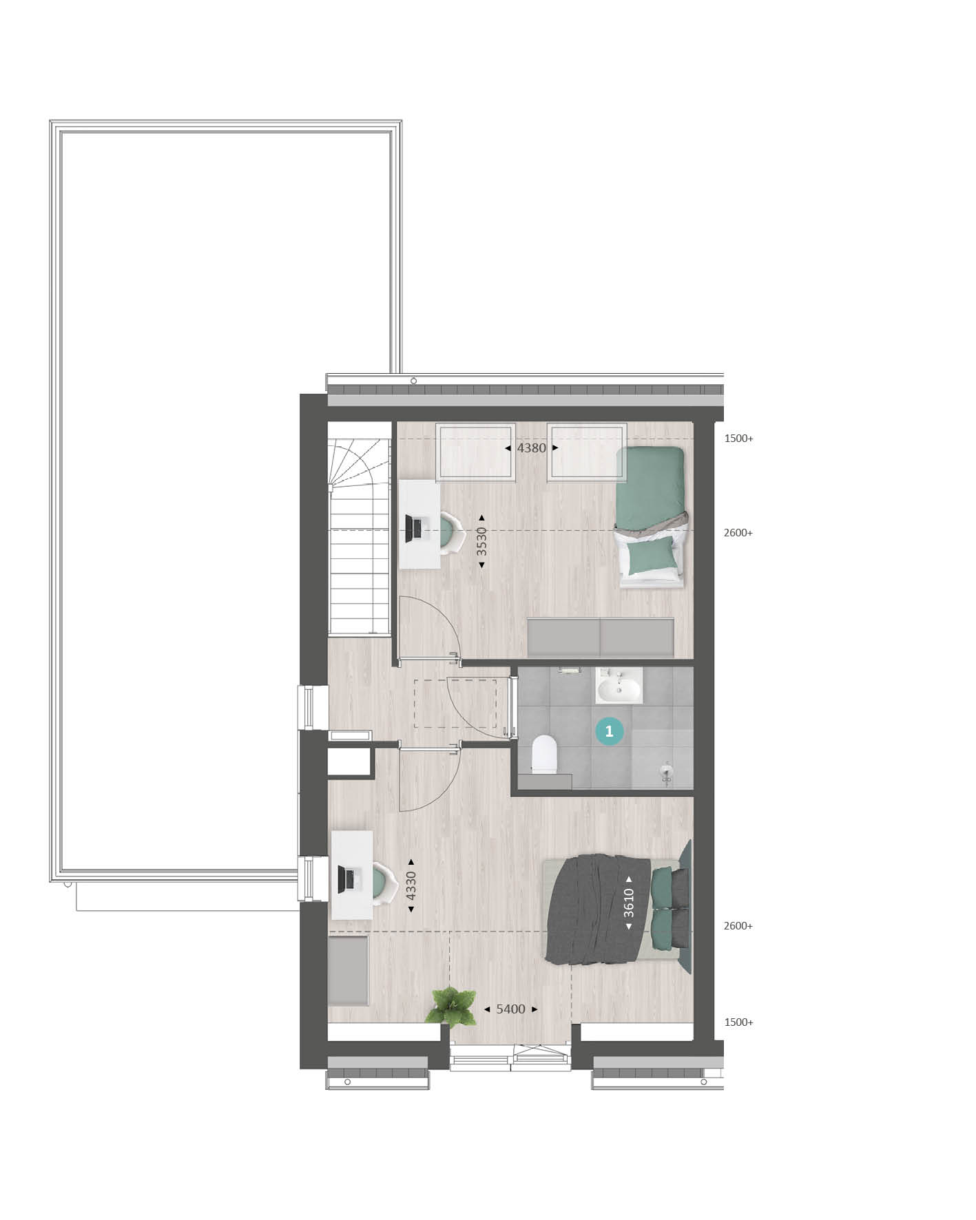 Op de verdieping vind je de overloop, twee slaapkamers en een bergruimte. Met de optie voor een dakkapel aan de achterzijde, creëer je veel extra ruimte en lichtinval in de slaapkamers. In de bergruimte is het mogelijk om een 2e badkamer te maken.