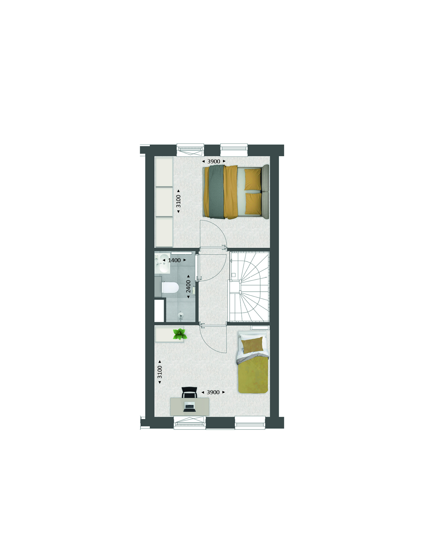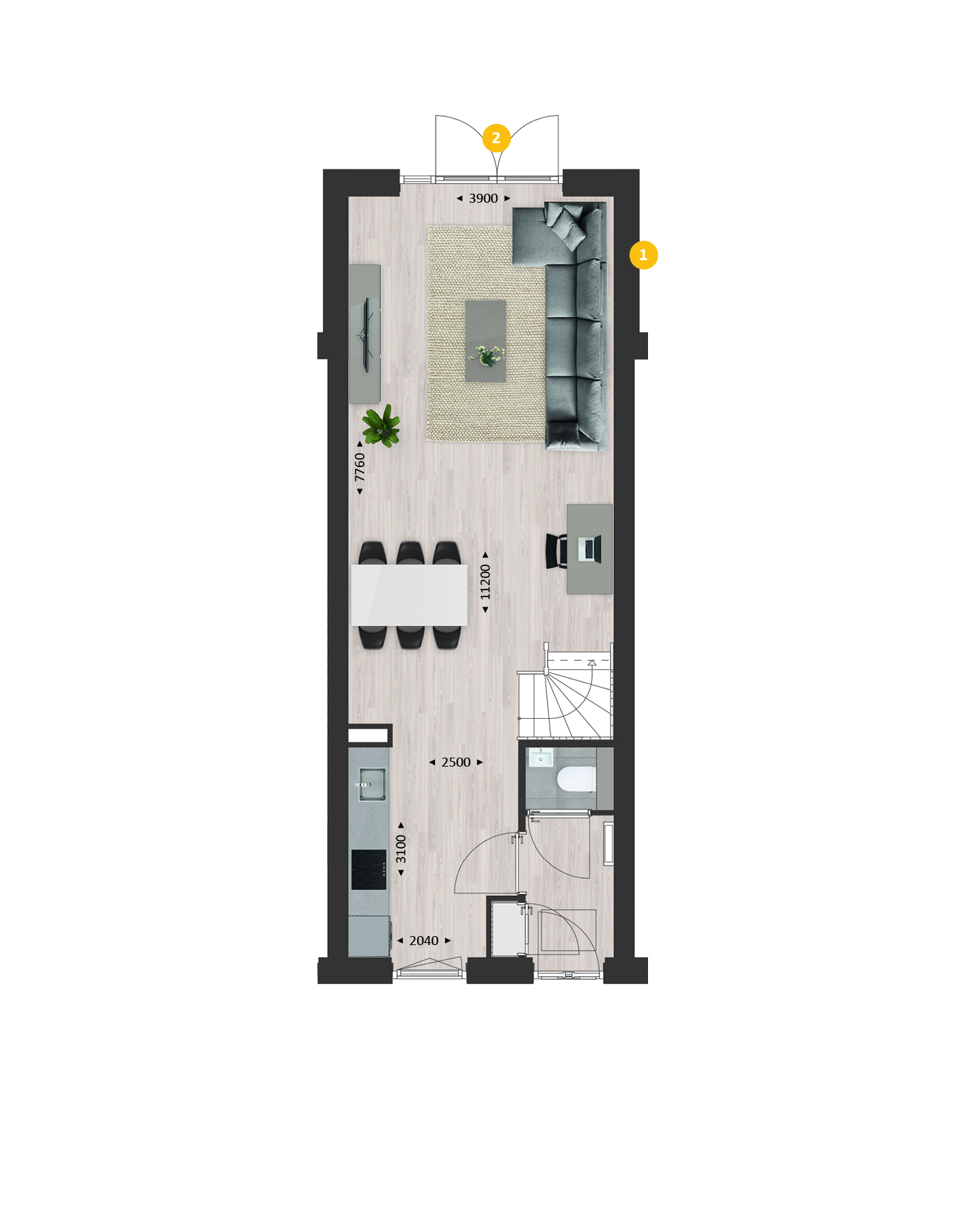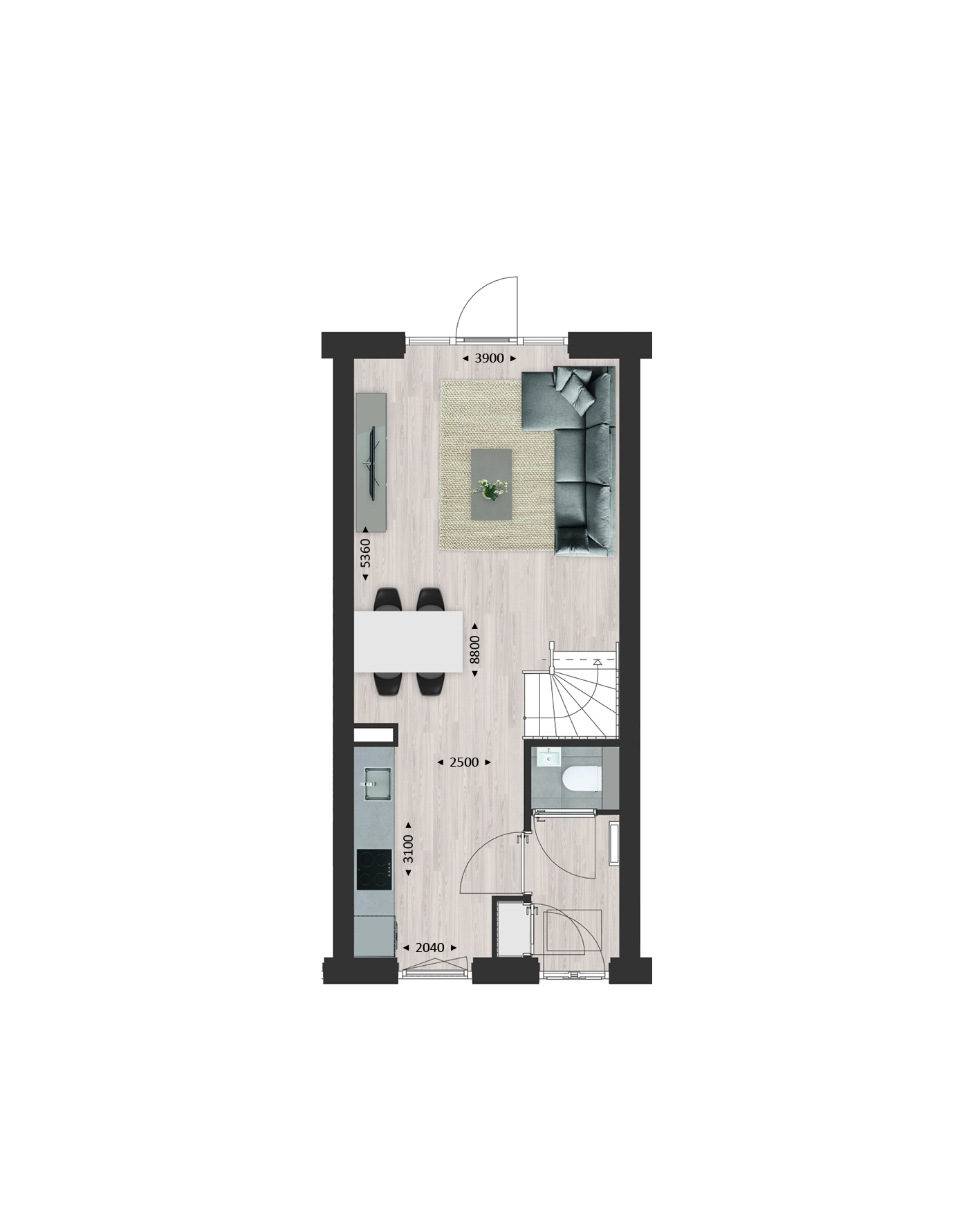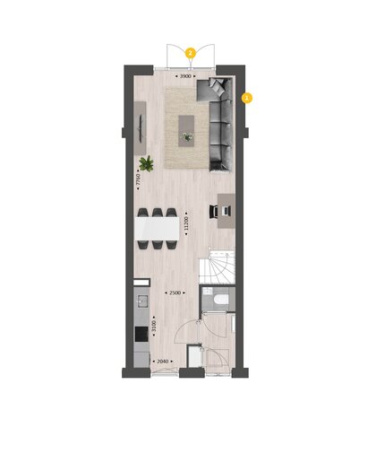 De indeling is bijzonder praktisch met beneden een hal met toilet en meterkast, een open keuken met zicht op de straat en een lichte tuingerichte woonkamer. Met bijv. een aanbouw van 1.20 meter en openslaande tuindeuren maak je de woonkamer nóg groter en lichter.