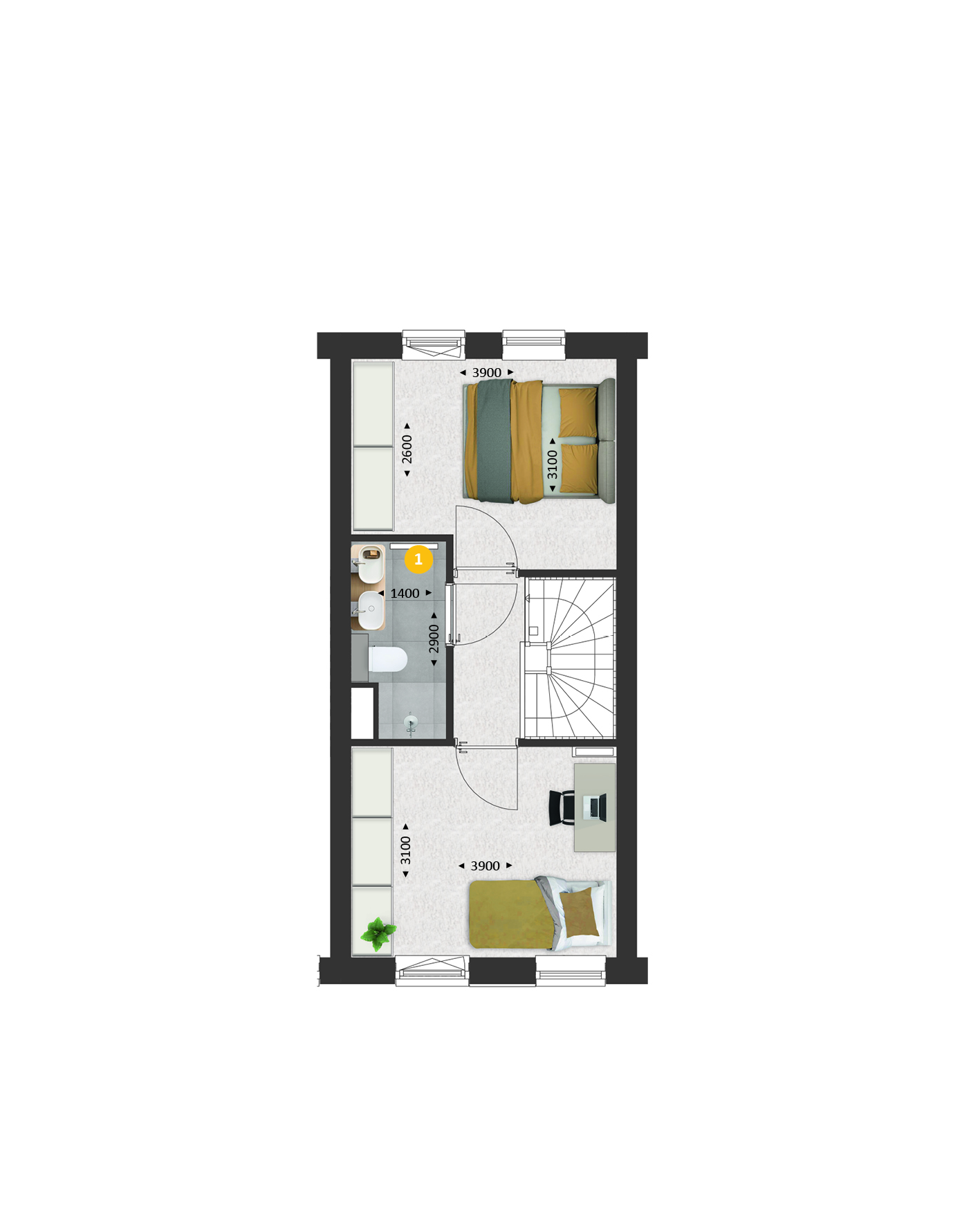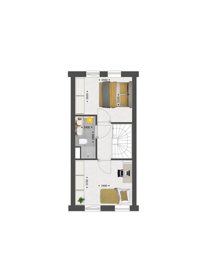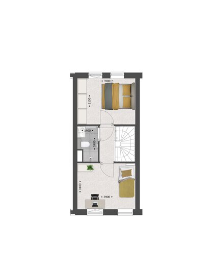 Op de verdieping vind je twee ruime slaapkamers, de badkamer met douche en wastafel en een techniekruimte met plek voor de wasmachine en droger.
