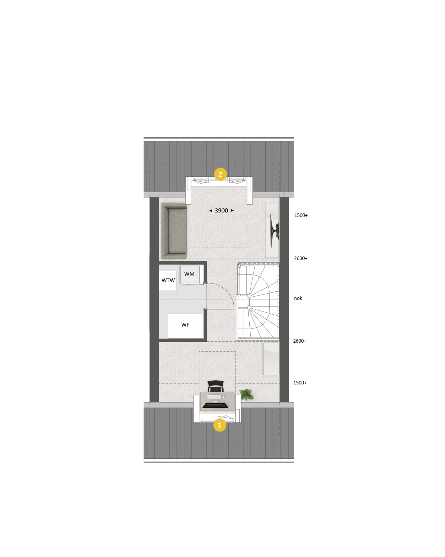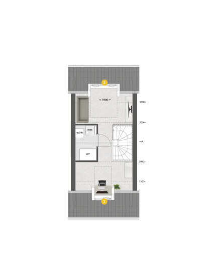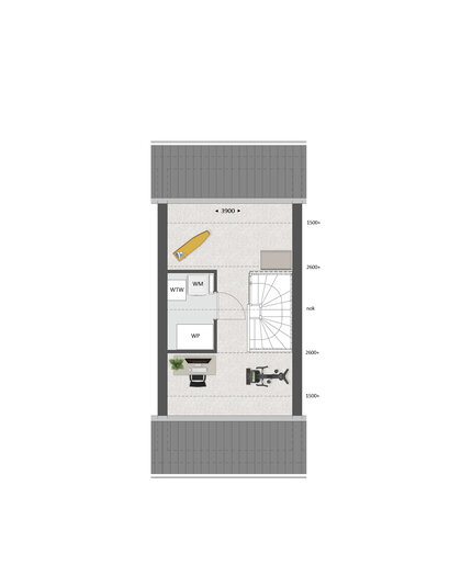 De tweede verdieping is standaard met een vaste trap bereikbaar. Hier is een ruime zolder aanwezig. Met diverse opties kun je hier een volwaardige woonverdieping van maken. Met voor eventueel dakkapellen aan de voor- en achterzijde én de indelingsoptie, creëer je hier twee kamers én een wasruimte.