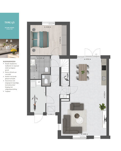 De indeling is bijzonder praktisch met beneden een hal met bijkeuken/berging, toilet, (hoofd)slaapkamer en badkamer met tweede toilet, douche en wastafel. Verder vind je op de begane grond een royale lichte woonkamer met zitgedeelte aan straatzijde en een open keuken met zicht op de tuin.