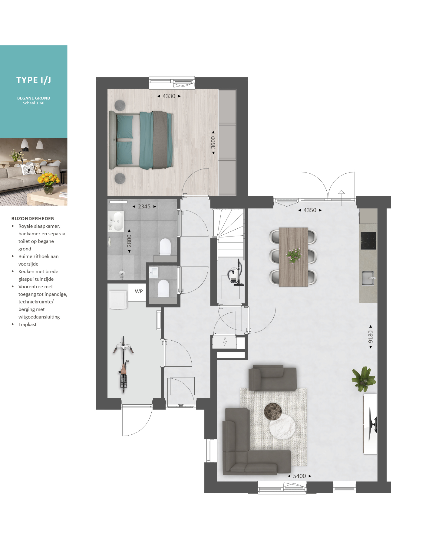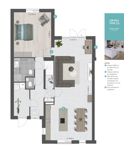 Met de diverse opties die we aanbieden kun je bijvoorbeeld de keuken naar de voorzijde verplaatsen en de woon- en slaapkamer vergroten. Je creëert hiermee veel extra leefruimte op de begane grond.