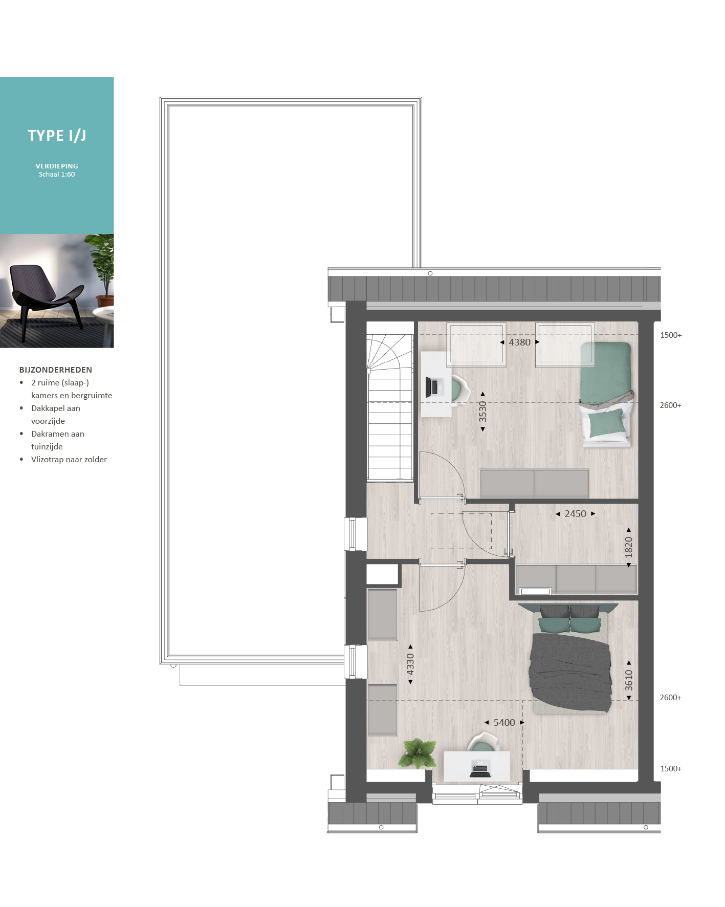 Op de verdieping vind je de overloop, twee slaapkamers en een bergruimte. Met de optie voor een dakkapel aan de achterzijde, creëer je veel extra ruimte en lichtinval in de slaapkamers. In de bergruimte is het mogelijk om een 2e badkamer te maken.