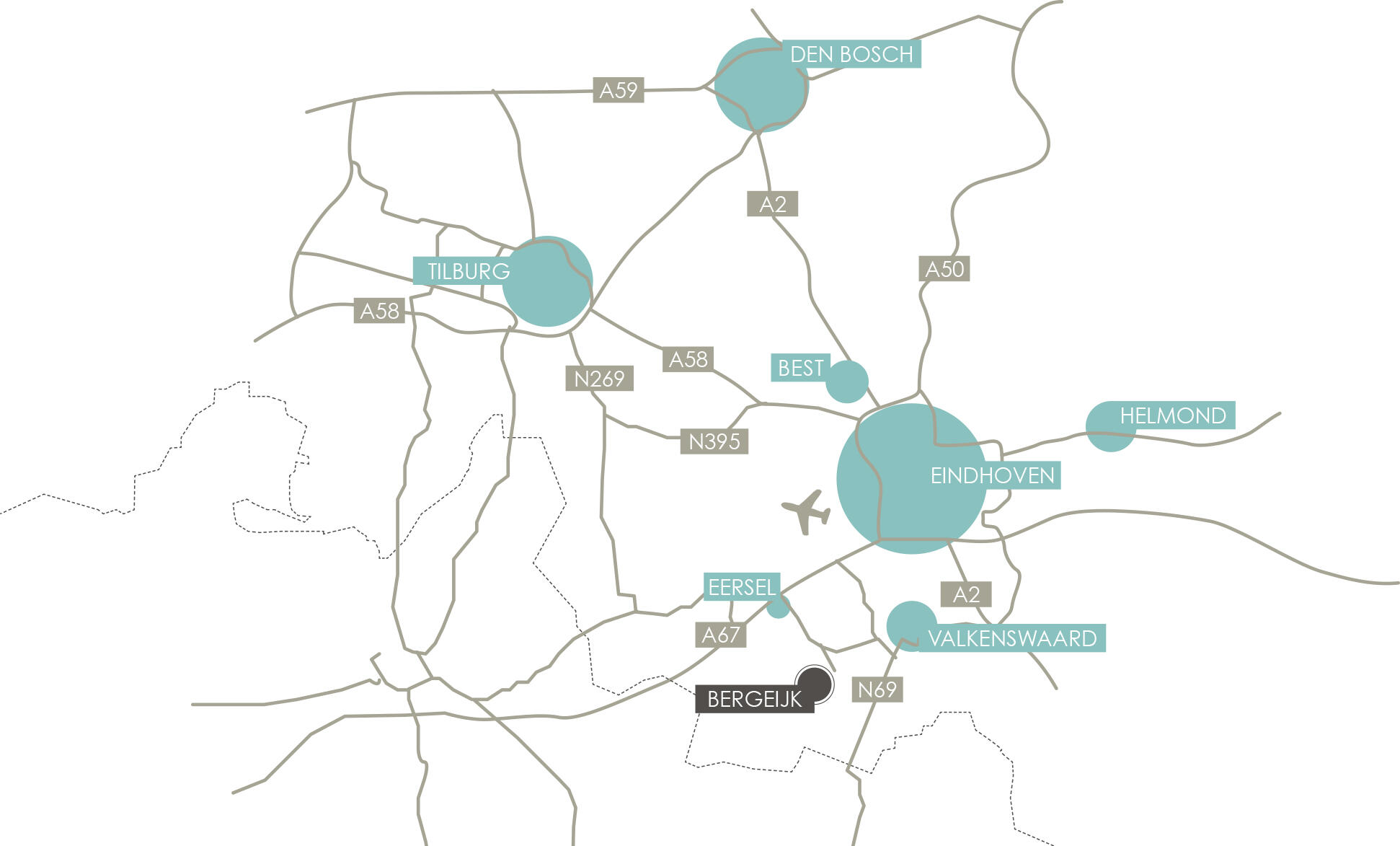 Bergeijk biedt een unieke mix van landelijke charme en nabijheid tot de bruisende Brainport-regio. Via de Diepveldenweg ben jij snel verbonden met de A67 en belangrijke werkgevers in de Brainportregio, zoals de ASML-campus in Veldhoven en de HTC (High Tech Campus) in Eindhoven. Ook het openbaar vervoer in Bergeijk is goed geregeld.