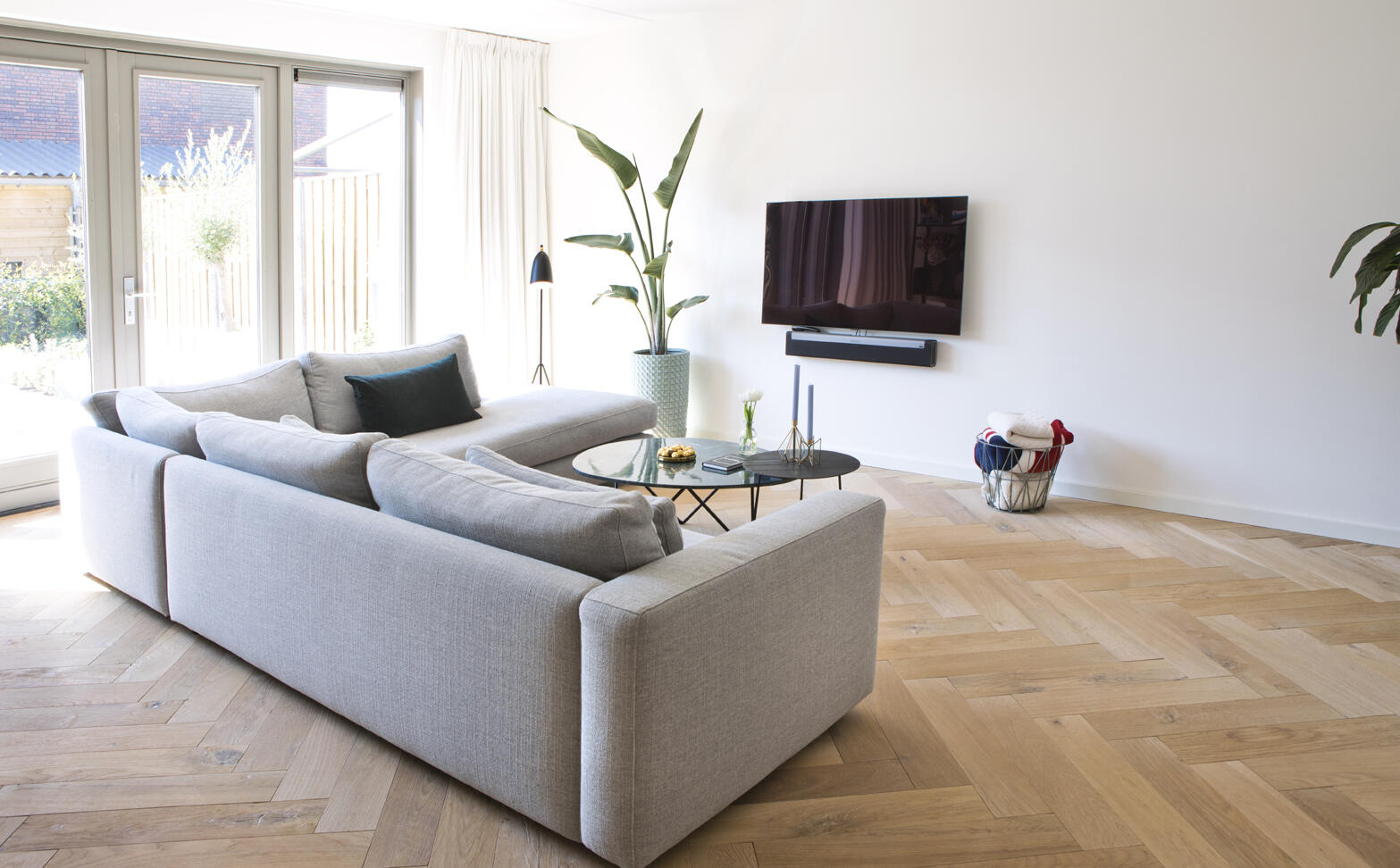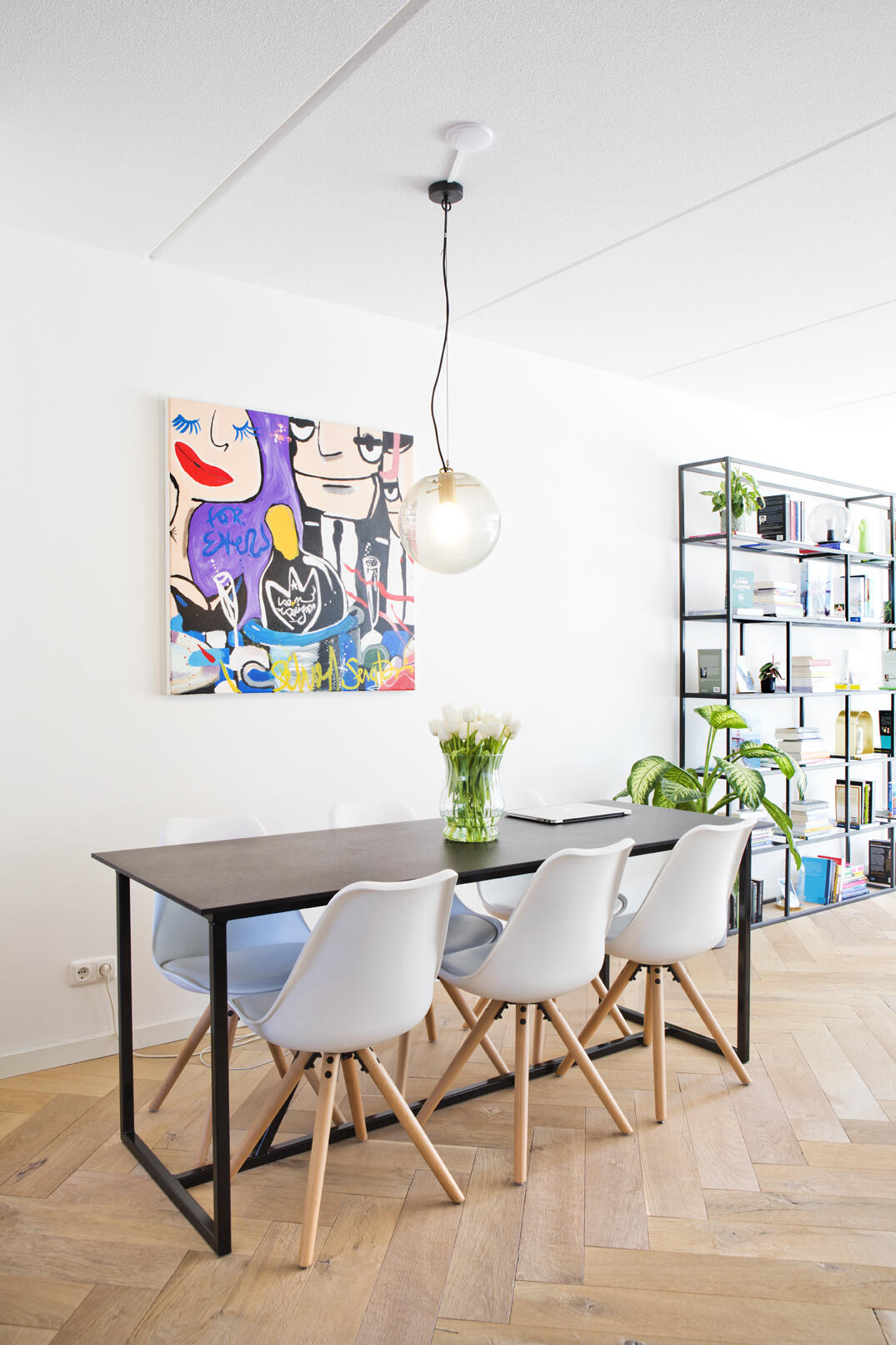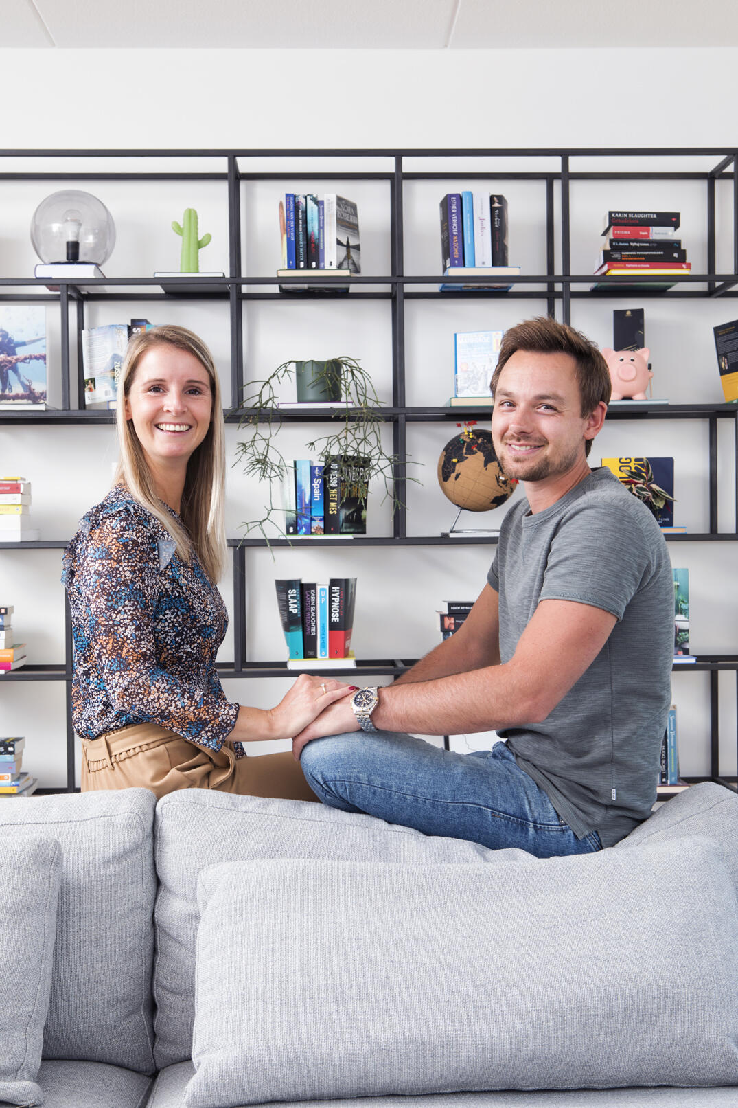 Dit sluit naadloos aan bij de Scandinavische interieurstijl die je vaak terugziet in de woning. “We houden allebei van lichte kleuren en materialen, eenvoudige accessoires en zelf ben ik gek op planten” aldus Kristy. Mede dankzij de uitbouw van 2,40 meter aan de achterzijde van de woning was een flinke muur beschikbaar en die is vrijwel geheel benut voor een wandmeubel met een breedte van zo’n 4,5 meter. Het stalen raamwerk is ontworpen door Kristy en door Jeroen en zijn vader in elkaar gelast. “We hebben dat in de werkplaats van mijn vader gedaan en moesten een vrachtwagen huren om de kast naar ons huis te brengen. Wel gaaf dat we dat helemaal zelf hebben kunnen doen.”