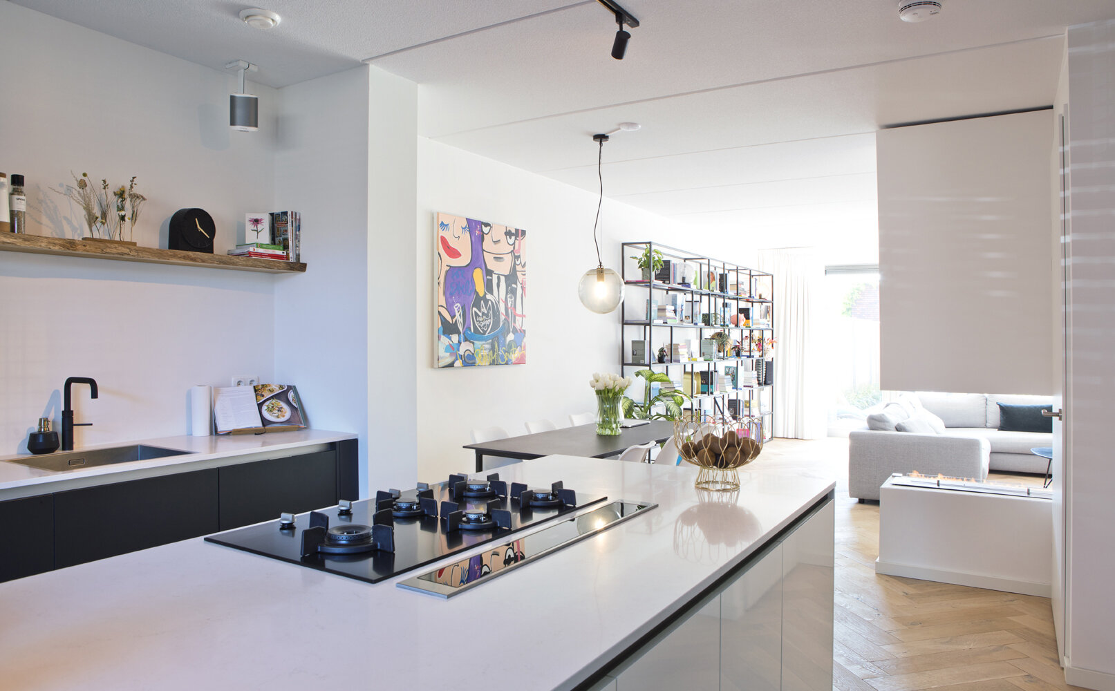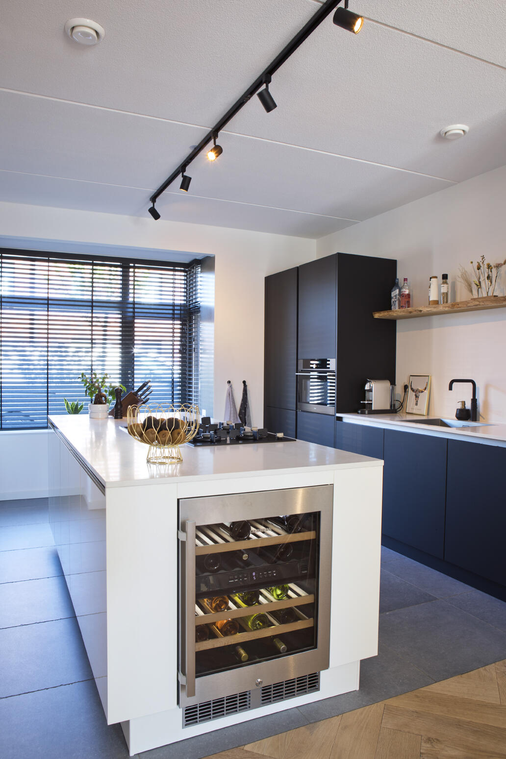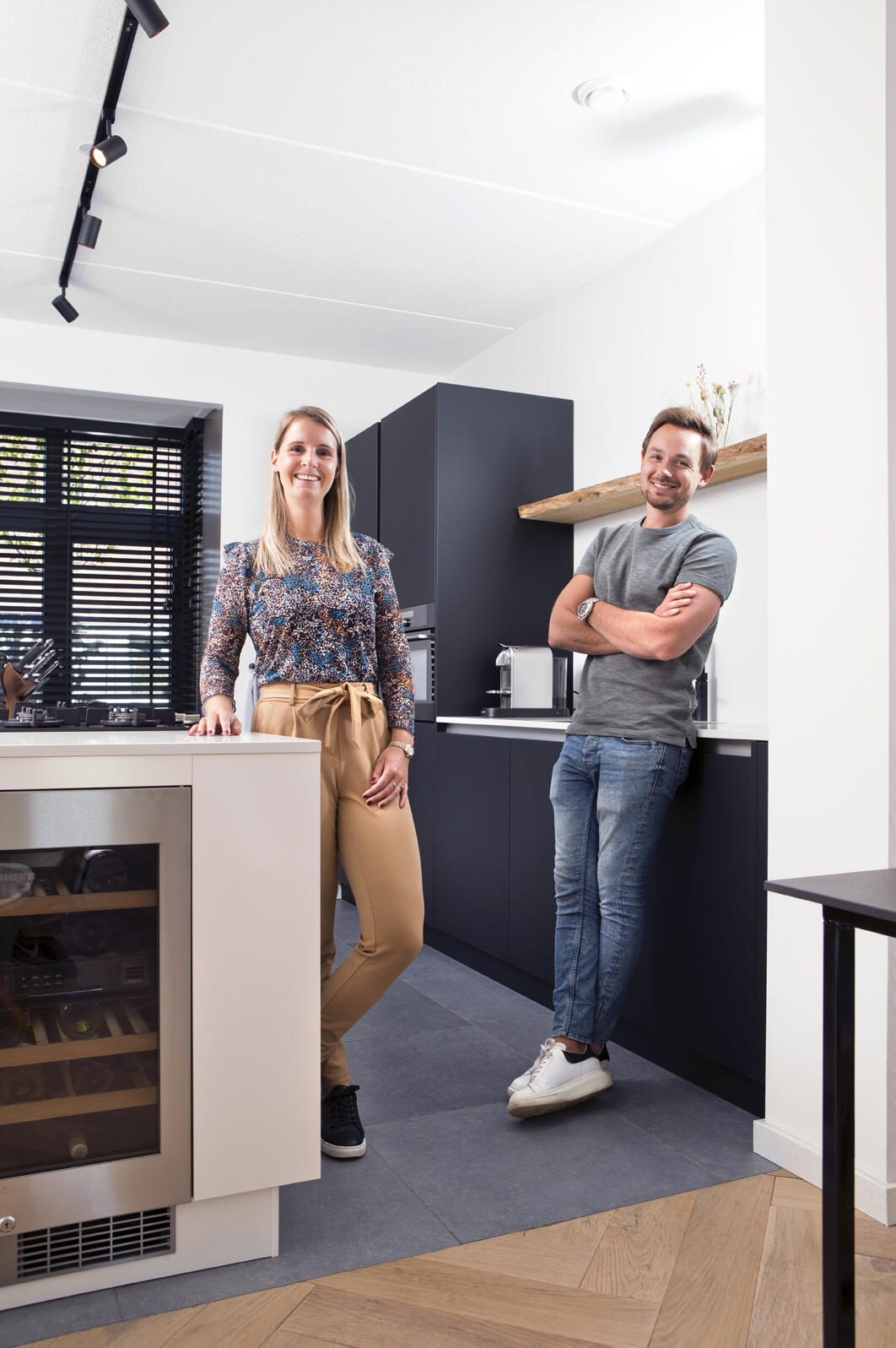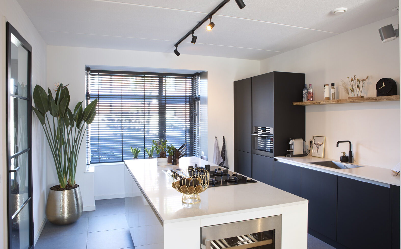 In de keuken kozen zij voor iets meer contrast: een wit kookeiland met op de kopse kant een wijnklimaatkast en tegen de wand een zwarte kast met veel bergruimte, een magnetron en een wit aanrechtblad en spoelbak. Op de vloer lichte grijze keramische tegels. Met bamboe shutters in de erker kunnen ze het daglicht naar wens regelen. De stalen deur met grote glasvlakken zorgt in de woning voor een extra ruimtelijke indruk.