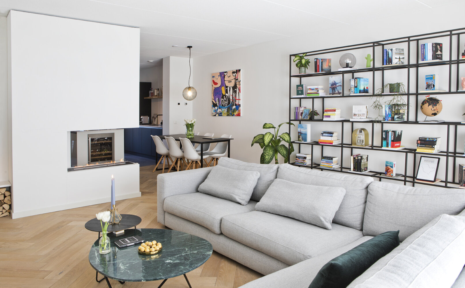 Het resultaat mag er zijn. Afwisseling in de manier waarop de boeken zijn geplaatst, enkele andere kleurige elementen en voldoende zicht op de witte achterwand maken deze kast tot het pronkstuk van de woonkamer. In combinatie met de lichtgrijze zithoek en de bio-ethanolhaard een heerlijke plek in de ruime woonkamer. Over de haard zegt Jeroen: “Om de grote open ruimte te breken hebben we gekozen voor een doorkijkhaard. Hierdoor krijg je vanaf de bank het gevoel dat je in een aparte ruimte zit, terwijl je toch contact houdt met de keuken.” Kristy en Jeroen hebben het interieur van de woonkamer verder grotendeels rustig en tijdloos gehouden, met vooral lichte kleuren en een warme houten vloer. Ook het metalen onderstel van de eettafel met een zwart composiet blad hebben vader en zoon zelf gelast.