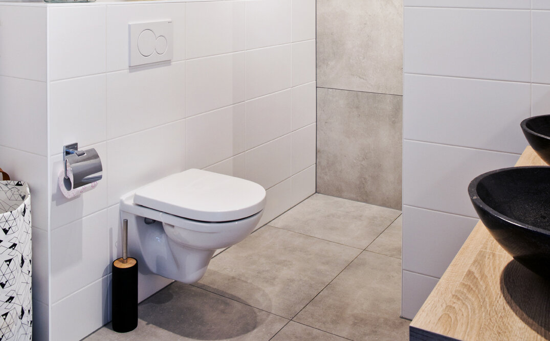 Op de eerste verdieping lieten Jeroen en Kristy de badkamer iets vergroten voor een wat ruimere inloop-regendouche, een toilet en een houten badkamermeubel met dubbele wasbak. De witte en lichtbeige tegels zorgen dat het licht en ruimtelijk oogt. Verder zijn er op de eerste etage drie slaapkamers en de zolderruimte is ingericht als privé “sportschool”.