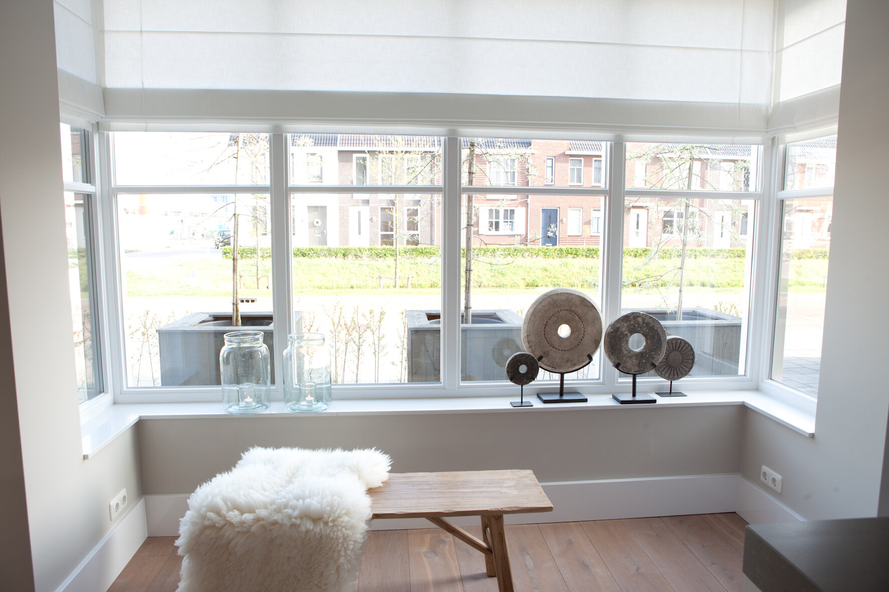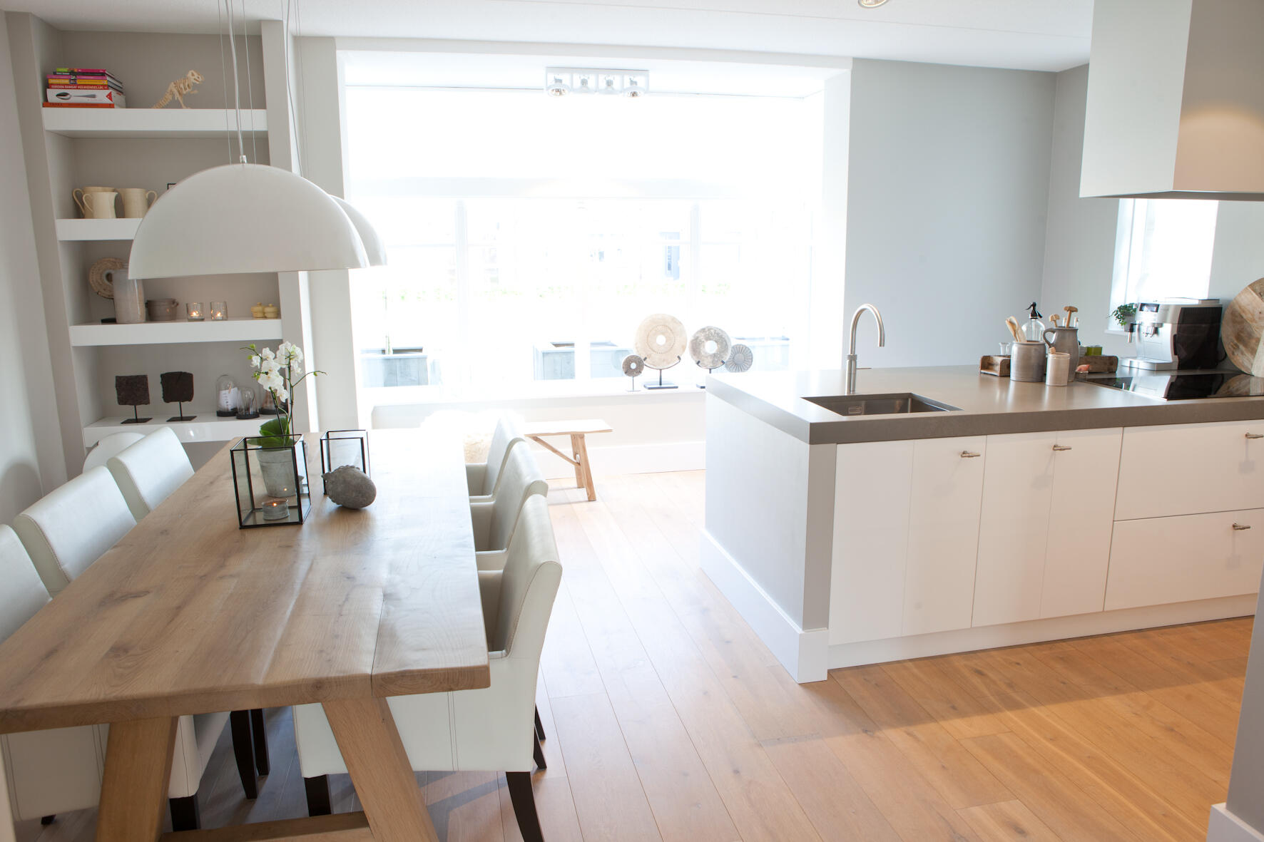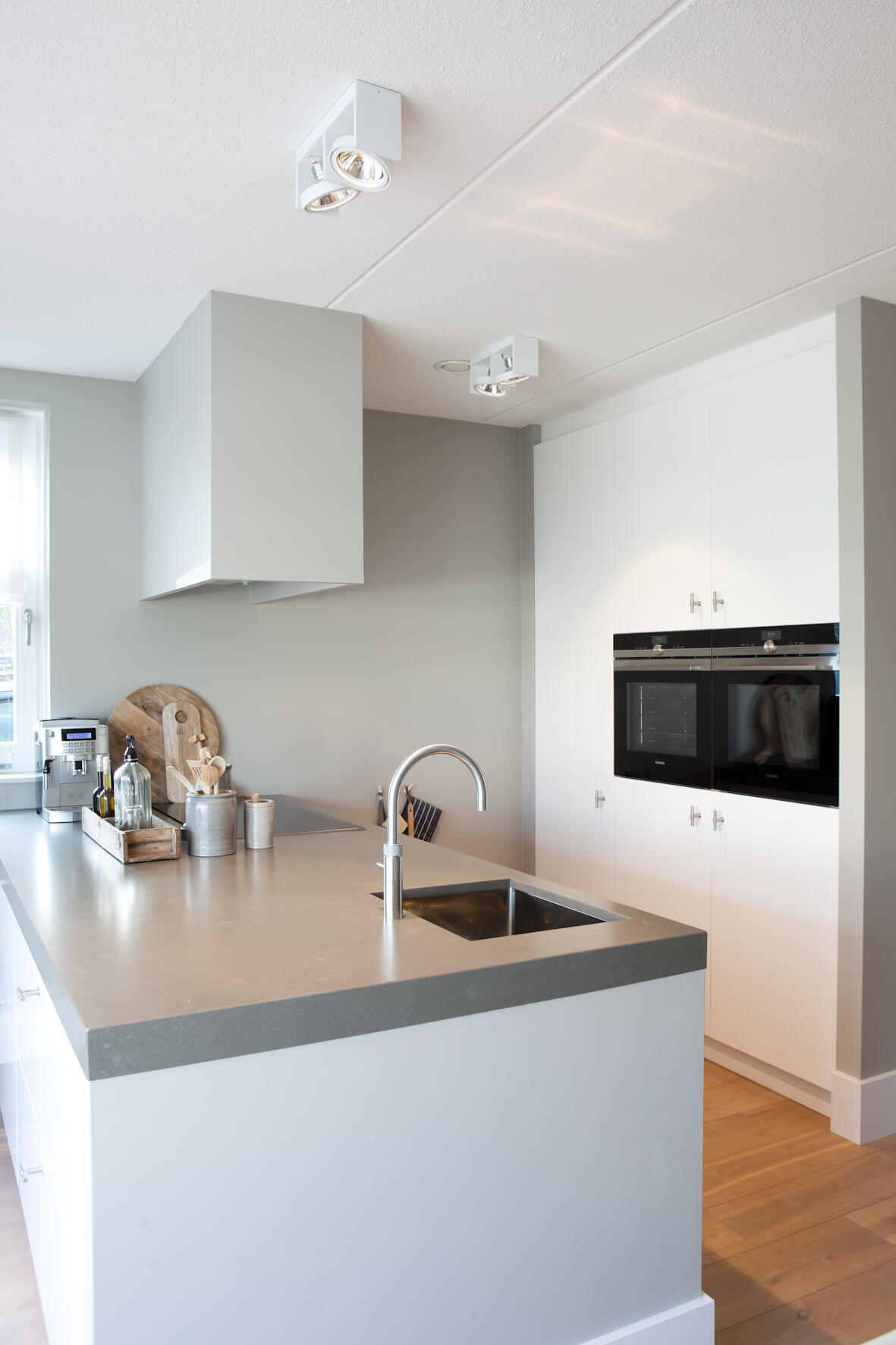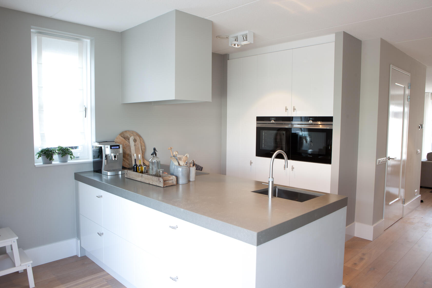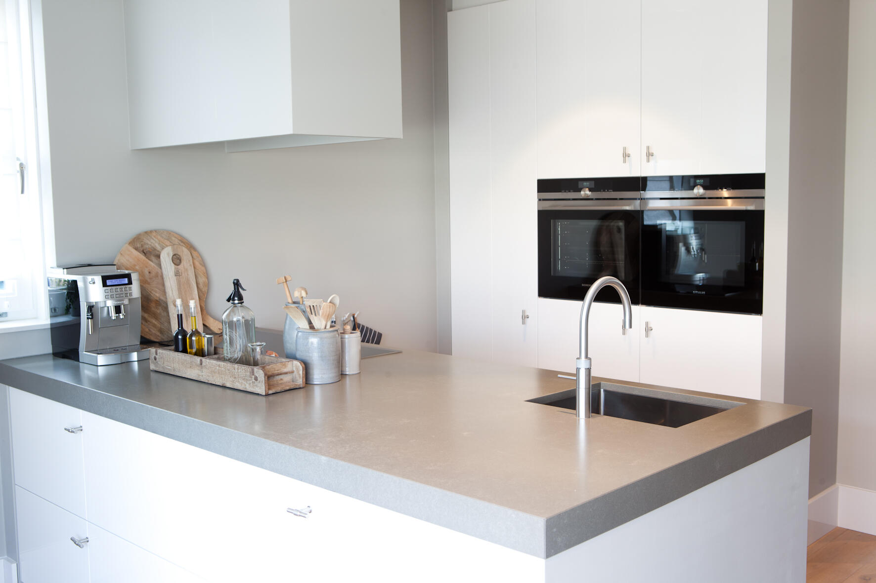 In de keuken kozen Bert en Linda voor een robuust aanrechtblad met ‘beton-look’, zoals ze het zelf noemen. “Het is een beetje Piet Boon-stijl, strak en toch met een natuurlijke uitstraling.” De kasten zijn hoogglans wit en de afzuigkap voert de etensgeuren direct af naar buiten. “We koken op een inductiekookplaat, dat deden we in ons vorige huis ook al.” De erker geeft een landelijke touch aan de keuken.
