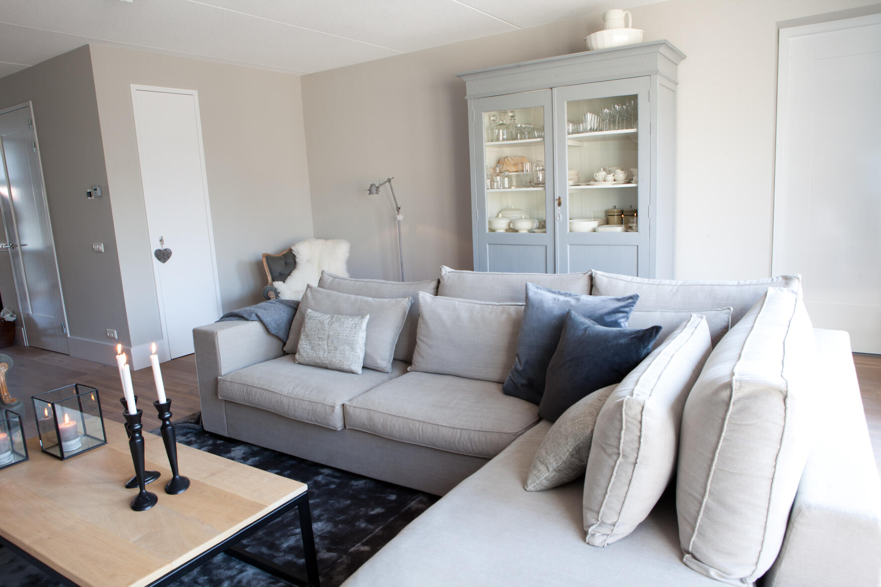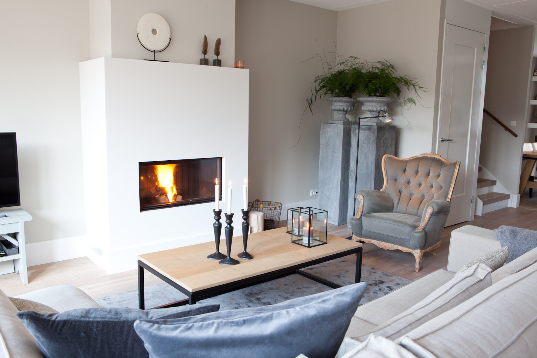 De brede, gesloten haard biedt sfeer en gezelligheid in de zithoek aan de tuinzijde. Een gashaard was hier niet mogelijk, omdat de woning niet op het gasnet is aangesloten. “Maar we konden deze haard wel in laten bouwen. Dat is natuurlijk heel sfeervol voor de donkere winteravonden.” Heel donker zal het niet gauw zijn in deze kamer met vooral lichte tinten, voorzien van een enkel accent. Mede dankzij de uitbouw van 2,40 meter is hier leefruimte te over.