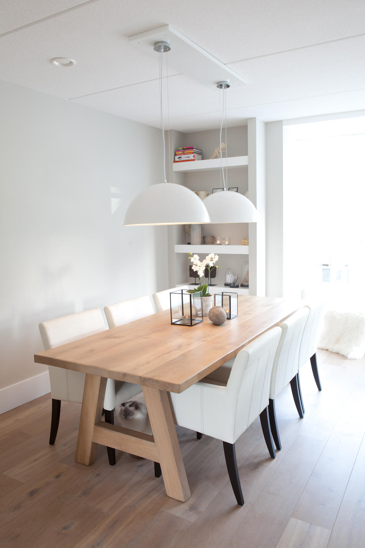 De massief houten eettafel is op maat gemaakt en staat in het keukengedeelte van de begane grond, aan de straatkant van de woning. “Op die manier hebben we daar alles bij elkaar, waardoor een fijne leefkeuken is ontstaan, terwijl we de zithoek aan de tuinzijde hebben.”
