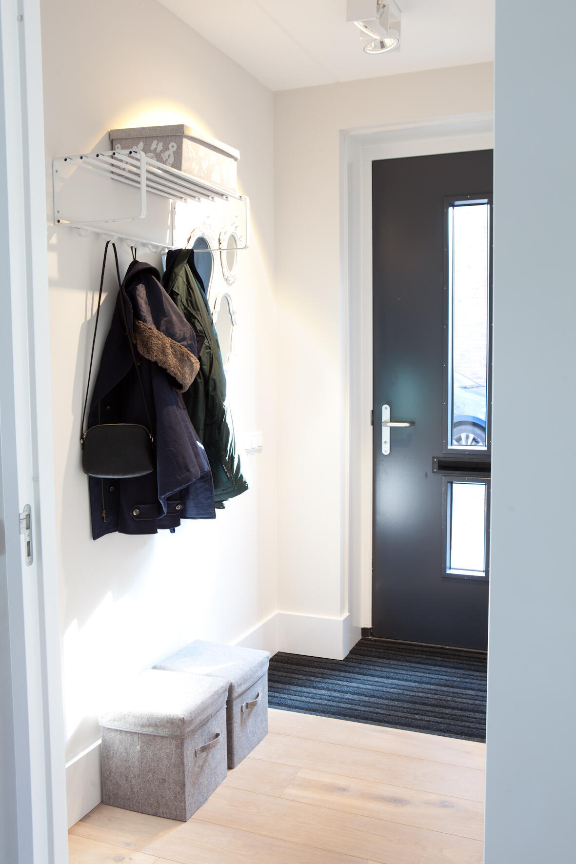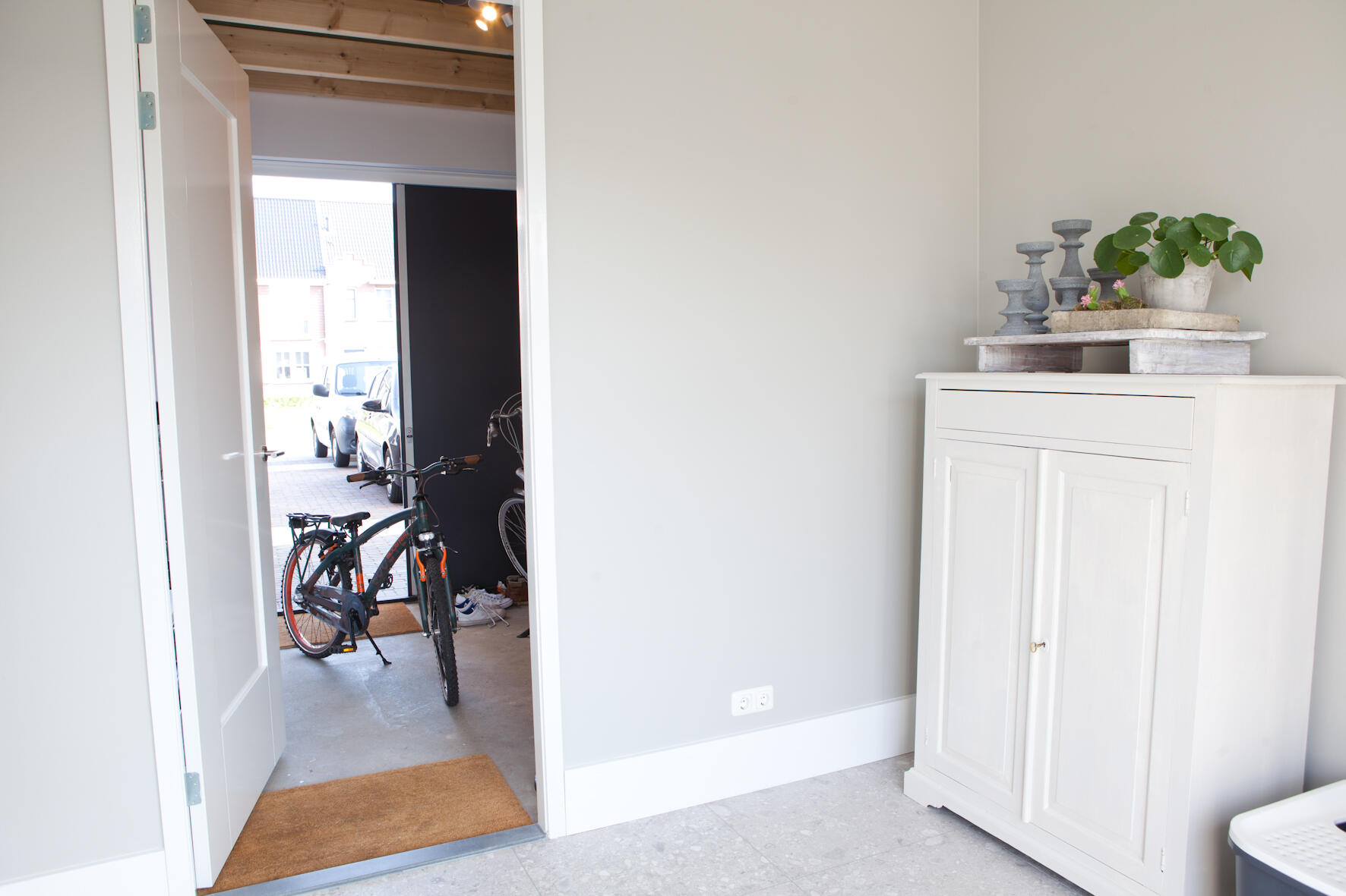 "We hebben de geïsoleerde garage verdeeld in twee ruimten van 3 bij 3 meter. Eén ruimte is bestemd voor de fietsen en het gereedschap. De andere ruimte is in gebruik als een soort bijkeuken, een plek waar onze kinderen hun vuile spullen achter kunnen laten en waar onze poezen kunnen overnachten. Je zou daar in de toekomst ook een kantoortje of een slaapkamer van kunnen maken.”