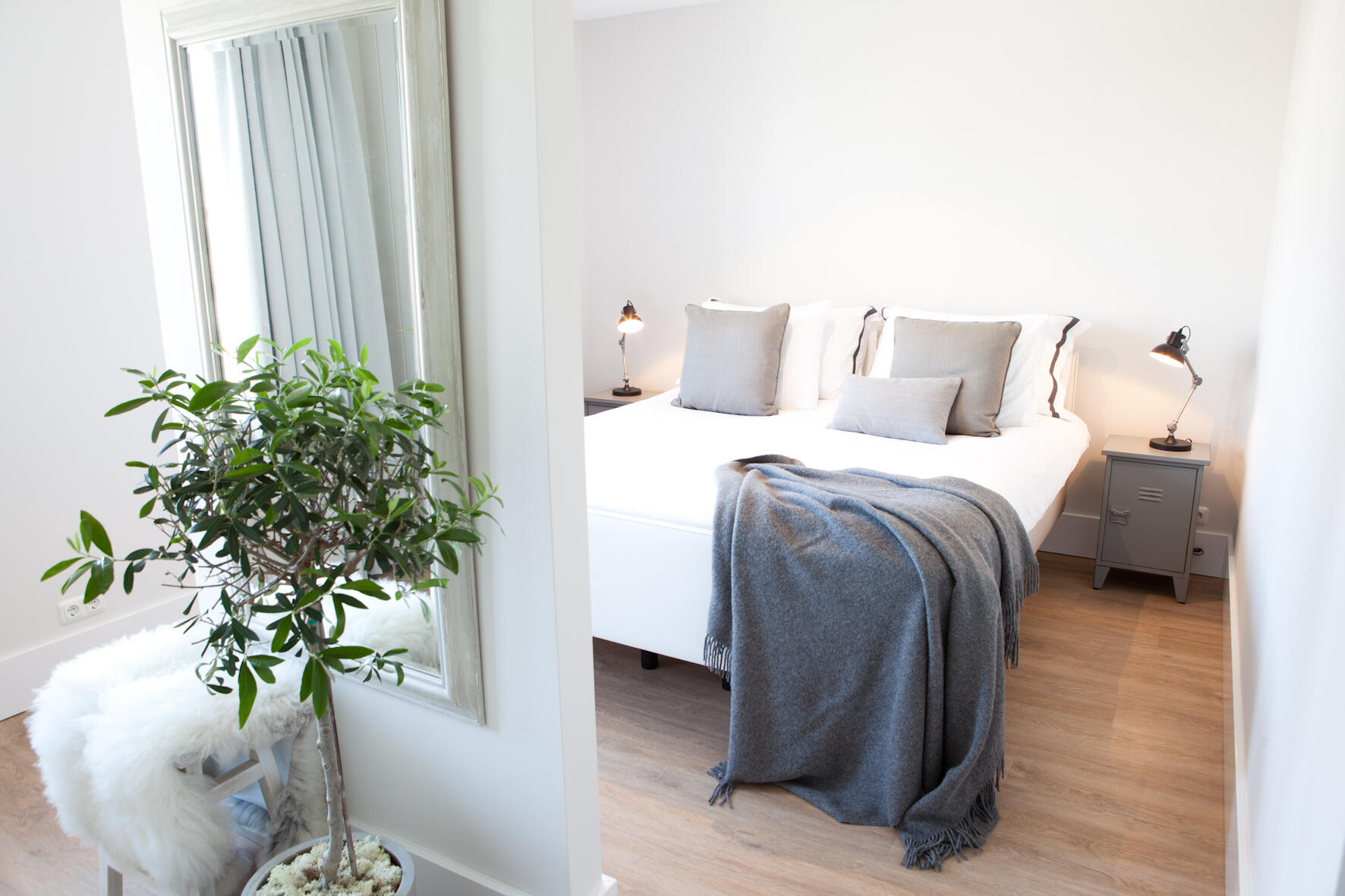 Standaard telde deze etage drie slaapkamers, maar twee kamers zijn hier samengevoegd tot één masterbedroom van vorstelijke omvang. Een bijzondere oplossing is gevonden voor het ophangen van de flatscreen: een soort roomdivider in het midden van de kamer; de andere zijde ervan biedt plaats aan de spiegel. ”Dat was een leuk idee van onze kopersbegeleider”, zeggen Linda en Bert.