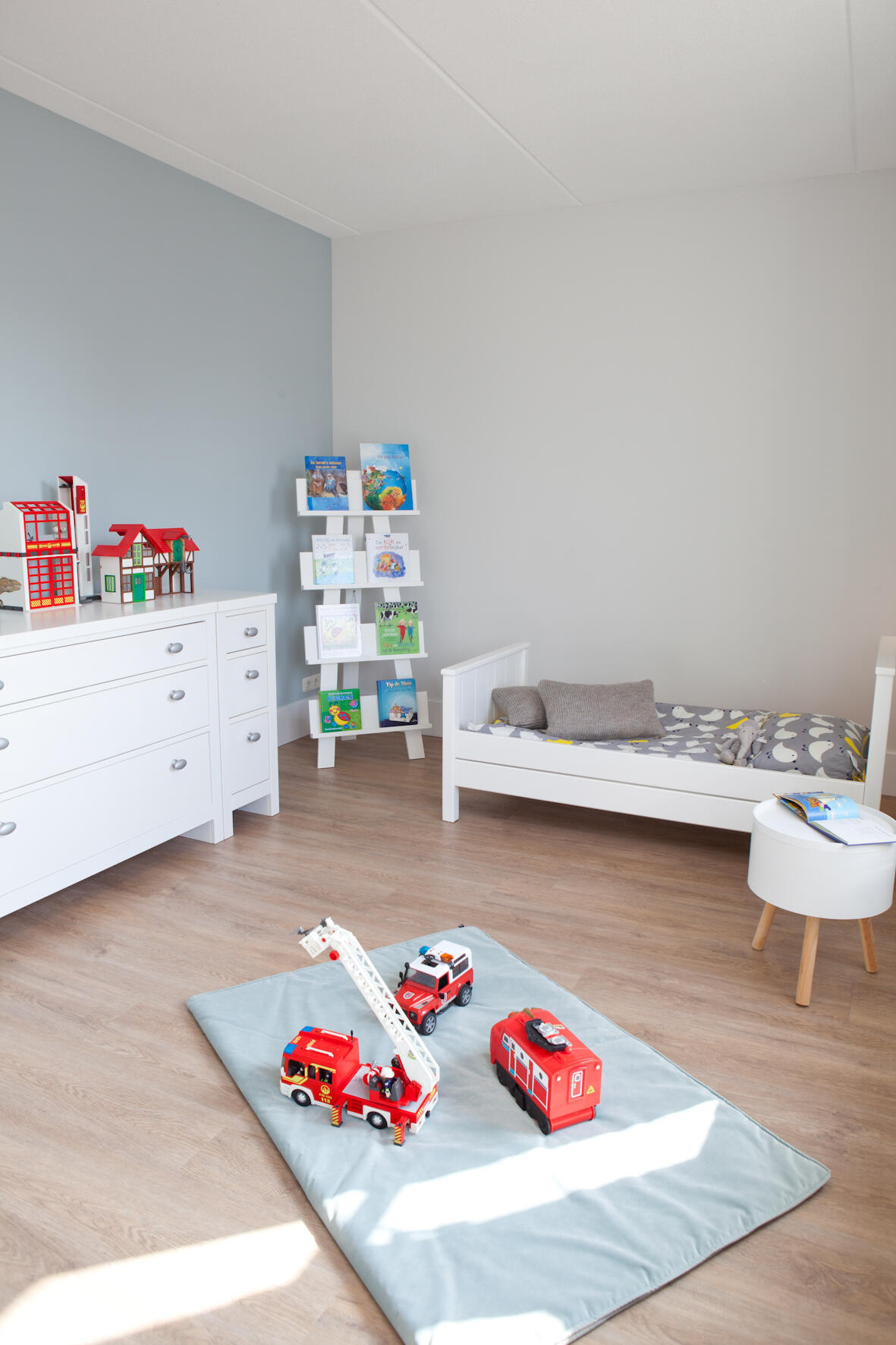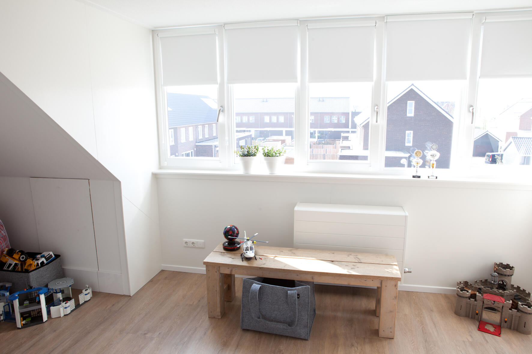 Een van de kinderen slaapt op de tweede kamer op de eerste verdieping. Op de afgewerkte zolderetage zijn drie ruimtes gerealiseerd: één slaapkamer voor de andere zoon, een praktische speelkamer en een ruimte die dienst doet als was- en strijkkamer. Naast de standaard dakkapel aan de voorzijde is de zolderetage aan de achterzijde nog van een extra grote dakkapel voorzien. “We hebben hier dus een zee van ruimte. We zijn echt blij dat we op deze manier eigenlijk al onze woonwensen hebben kunnen vervullen”, zeggen Linda en Bert.