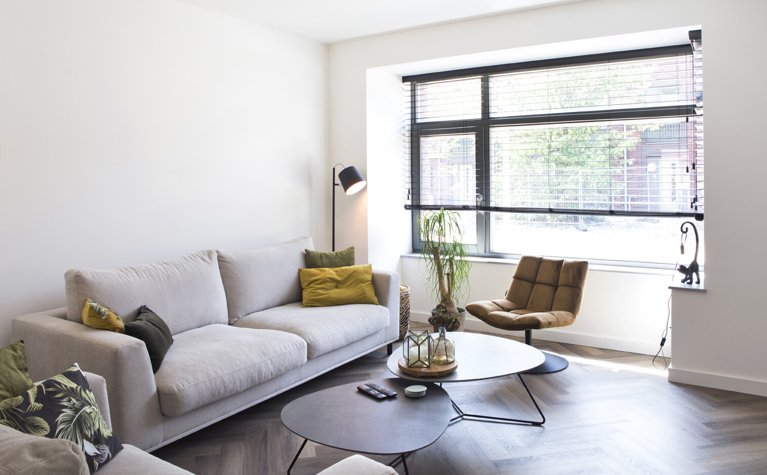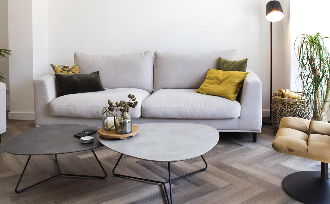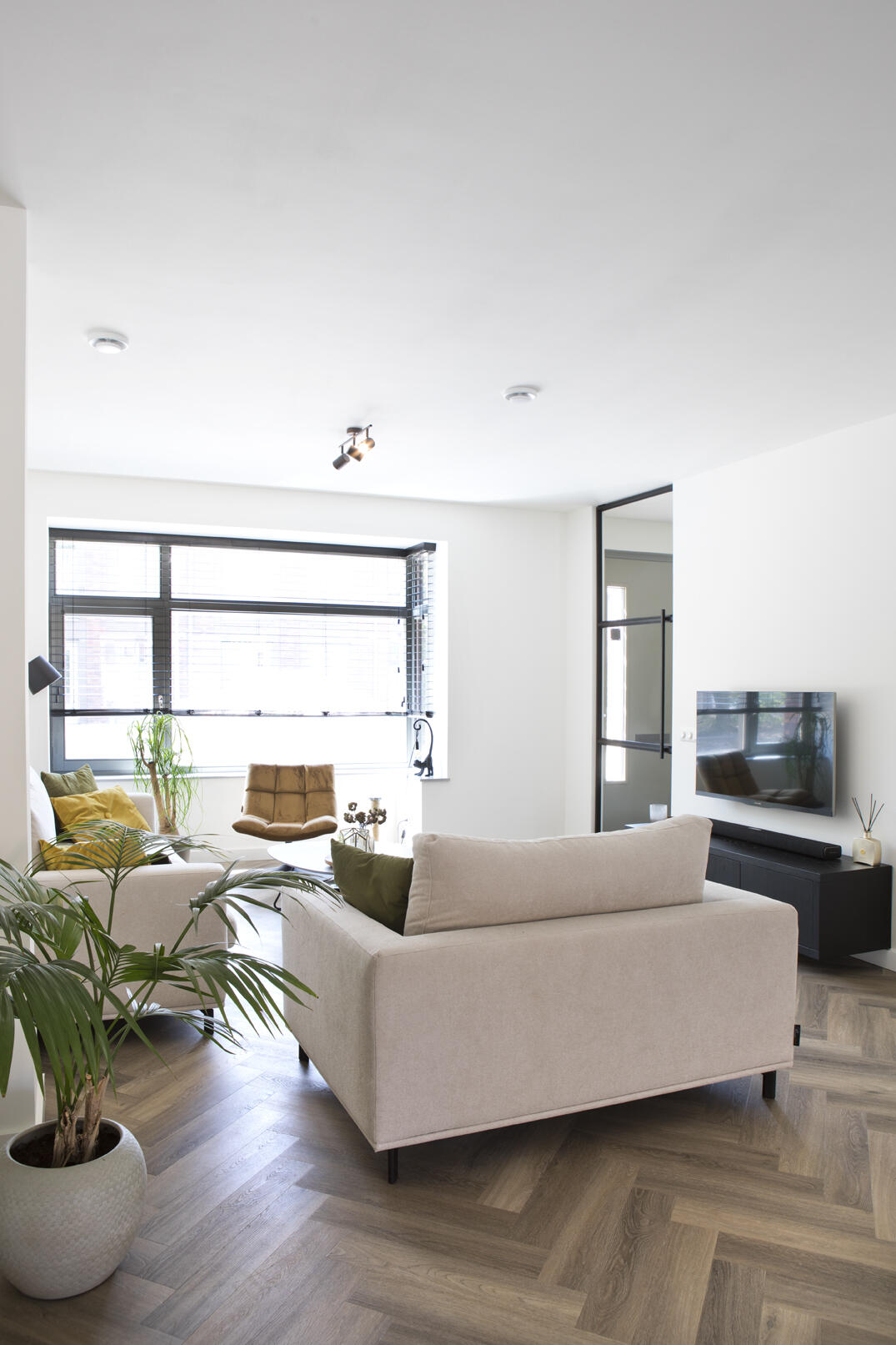 Ze kozen voor lichte kleuren en redelijk strakke lijnen in de inrichting van de woonkamer. De zithoek is gesitueerd aan de voorzijde van de woning, waar ze een mooi uitzicht op het parkje aan de overkant van de straat hebben.
