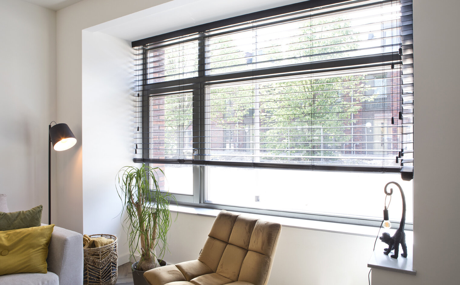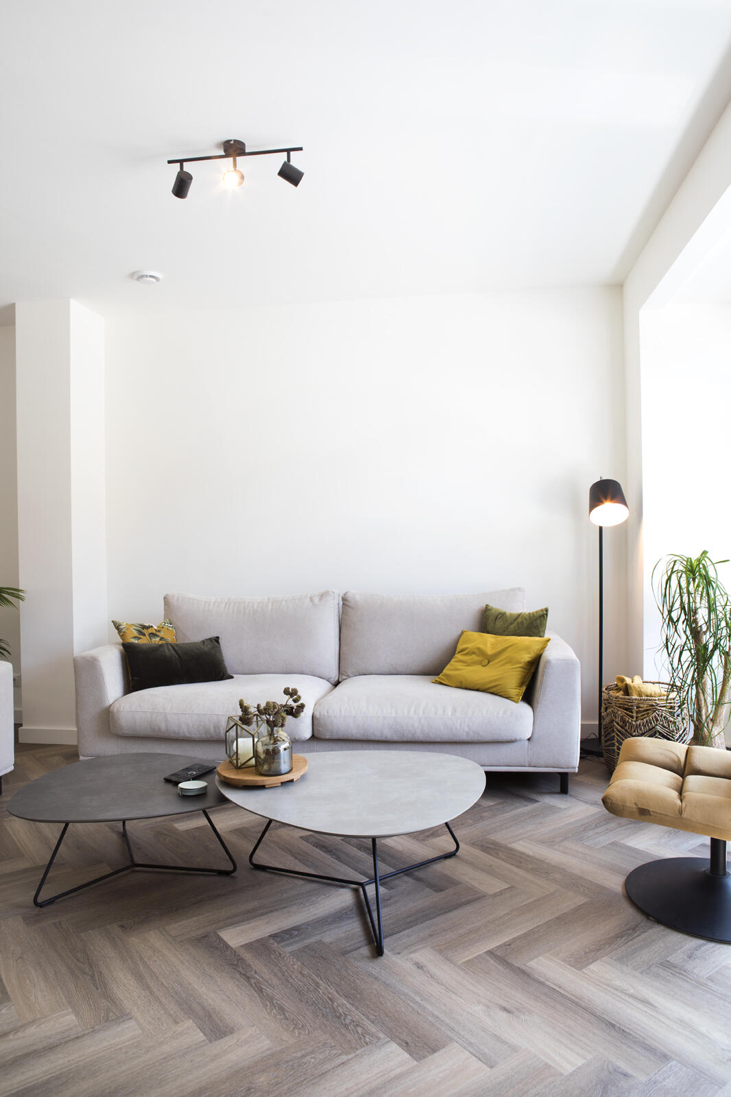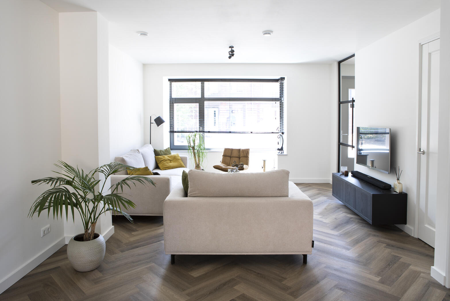 Ze kozen voor lichte kleuren en redelijk strakke lijnen in de inrichting van de woonkamer. De zithoek is gesitueerd aan de voorzijde van de woning, waar ze een mooi uitzicht op het parkje aan de overkant van de straat hebben.