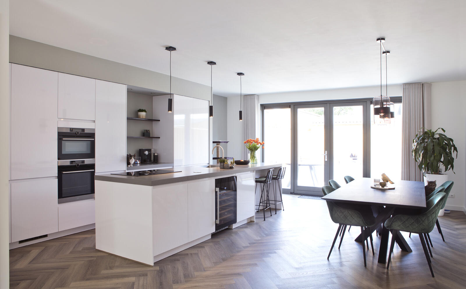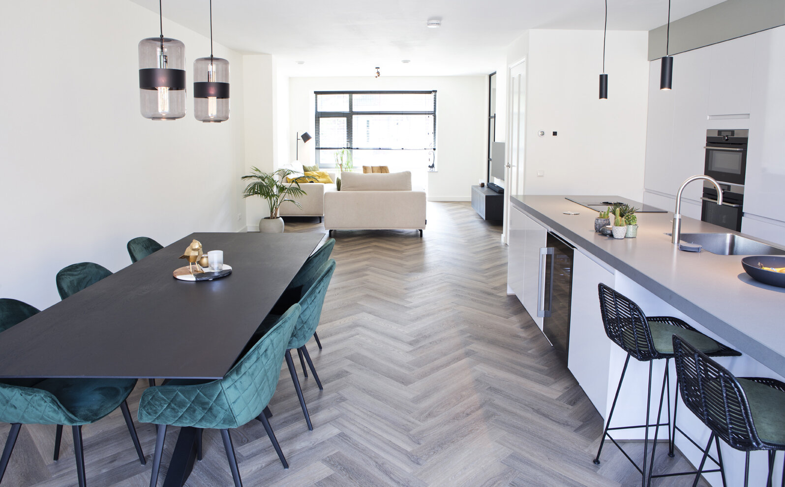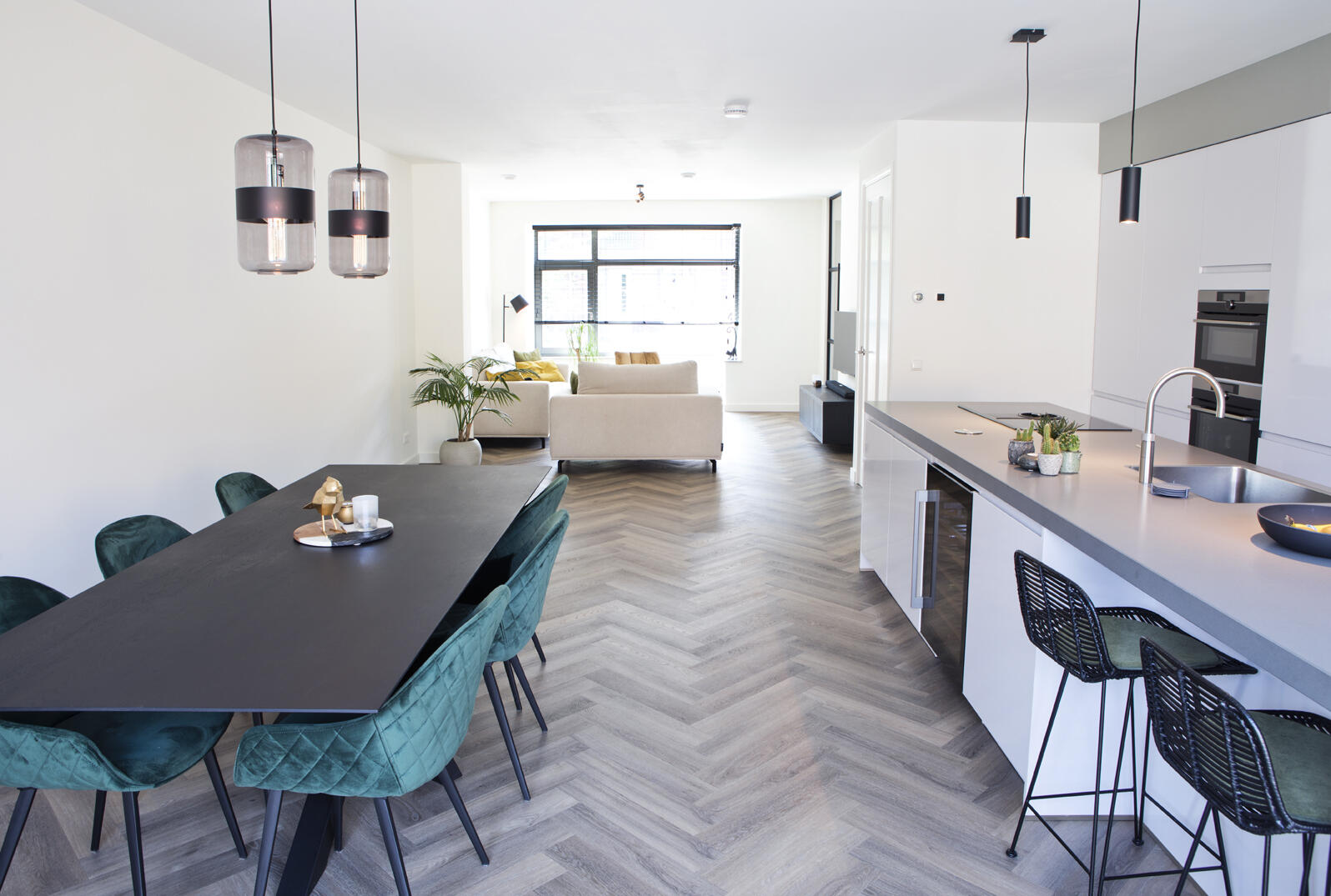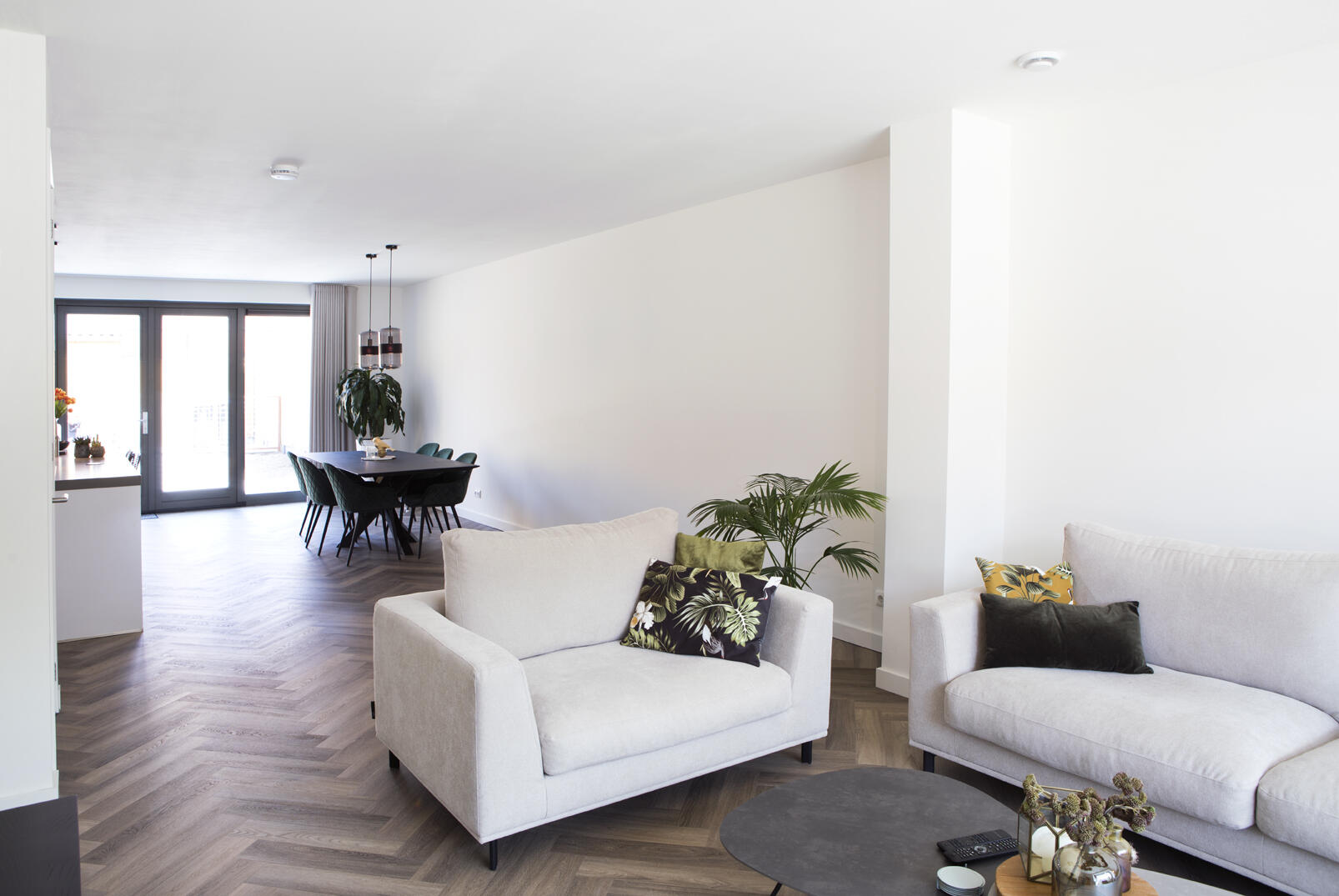 Een sterke basis voor de hele benedenverdieping vormt de pvc-vloer in houtlook. “Stevig, praktisch en kostentechnisch interessant.” Het plafond is strak afgewerkt en de bovenlichten boven de twee andere deuren in de woonkamer zijn dichtgemaakt. De dubbele openslaande deuren aan de achterkant vormen bij mooi weer een ruime verbinding met de leefruimte buiten.