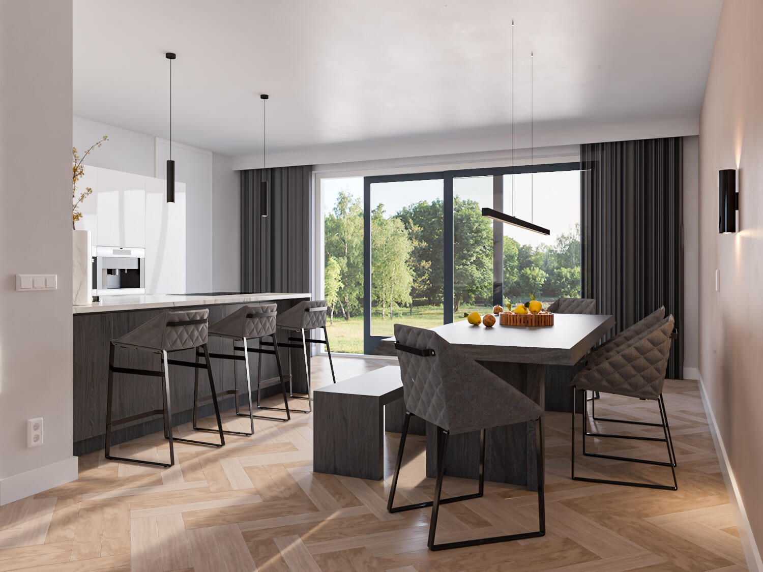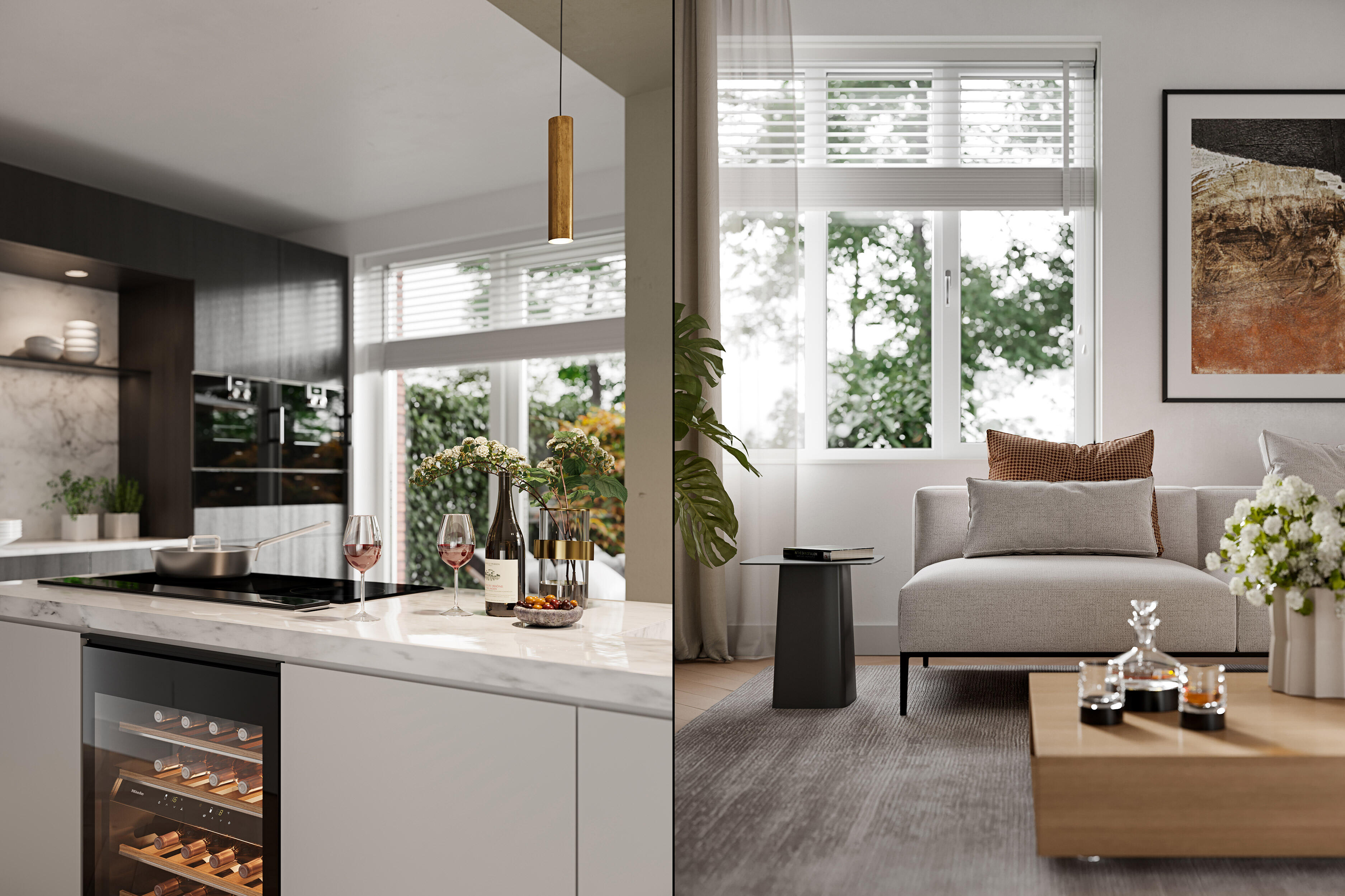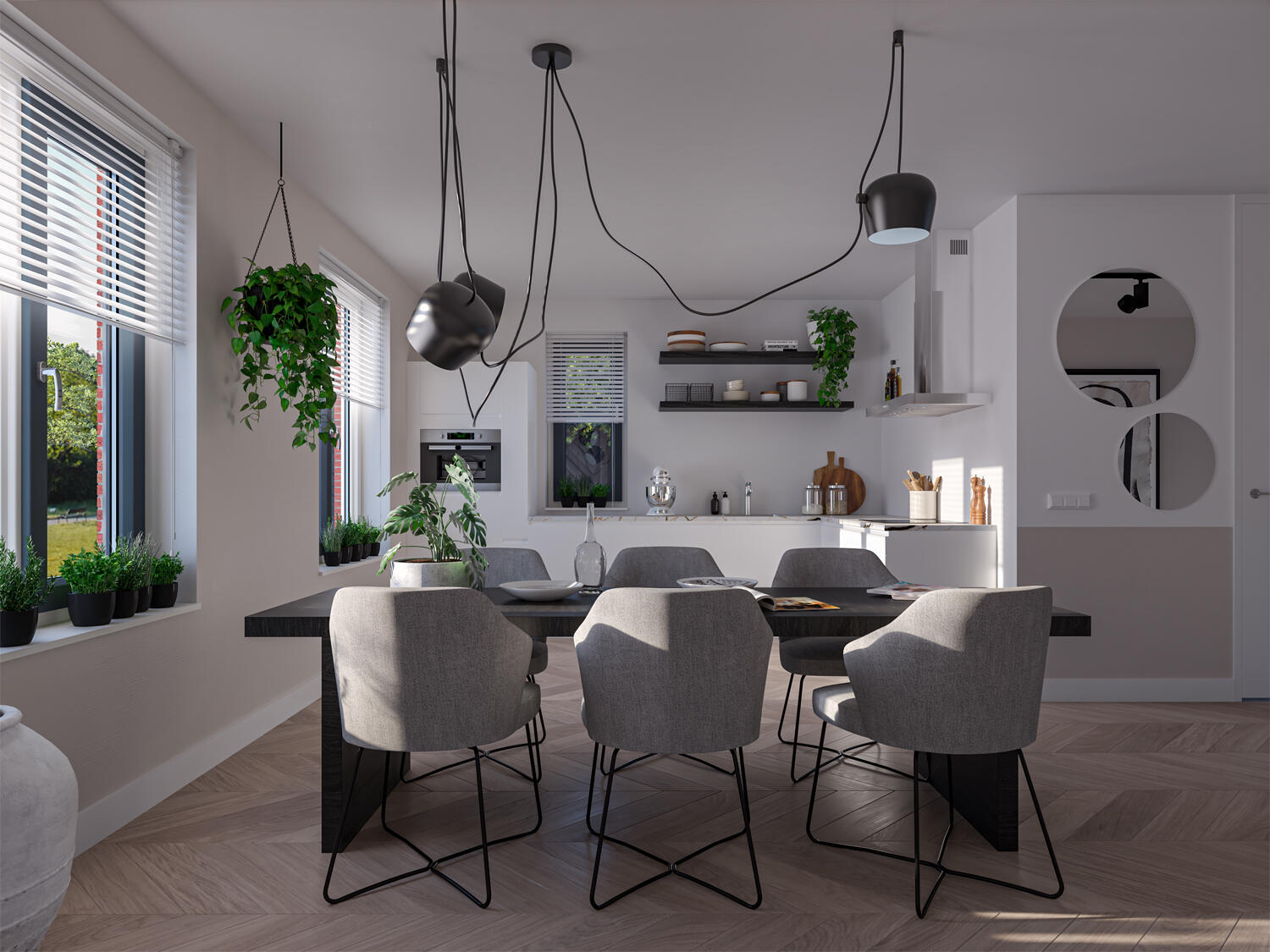 De indeling is bijzonder praktisch met beneden een hal met toilet en garderobe, een lichte L-vormige woonkamer, een open keuken met ruime eethoek. De begane grond kan vergroot worden met een uitbouw van 1.20 of 2.40 meter, waarbij de keuken eventueel naar de voorzijde verplaatst kan worden. Met de optie om de garage te verlengen en/of te splitsen in een berging en een ruimte bij de woning te betrekken, creëer je extra veel leefruimte op de begane grond.