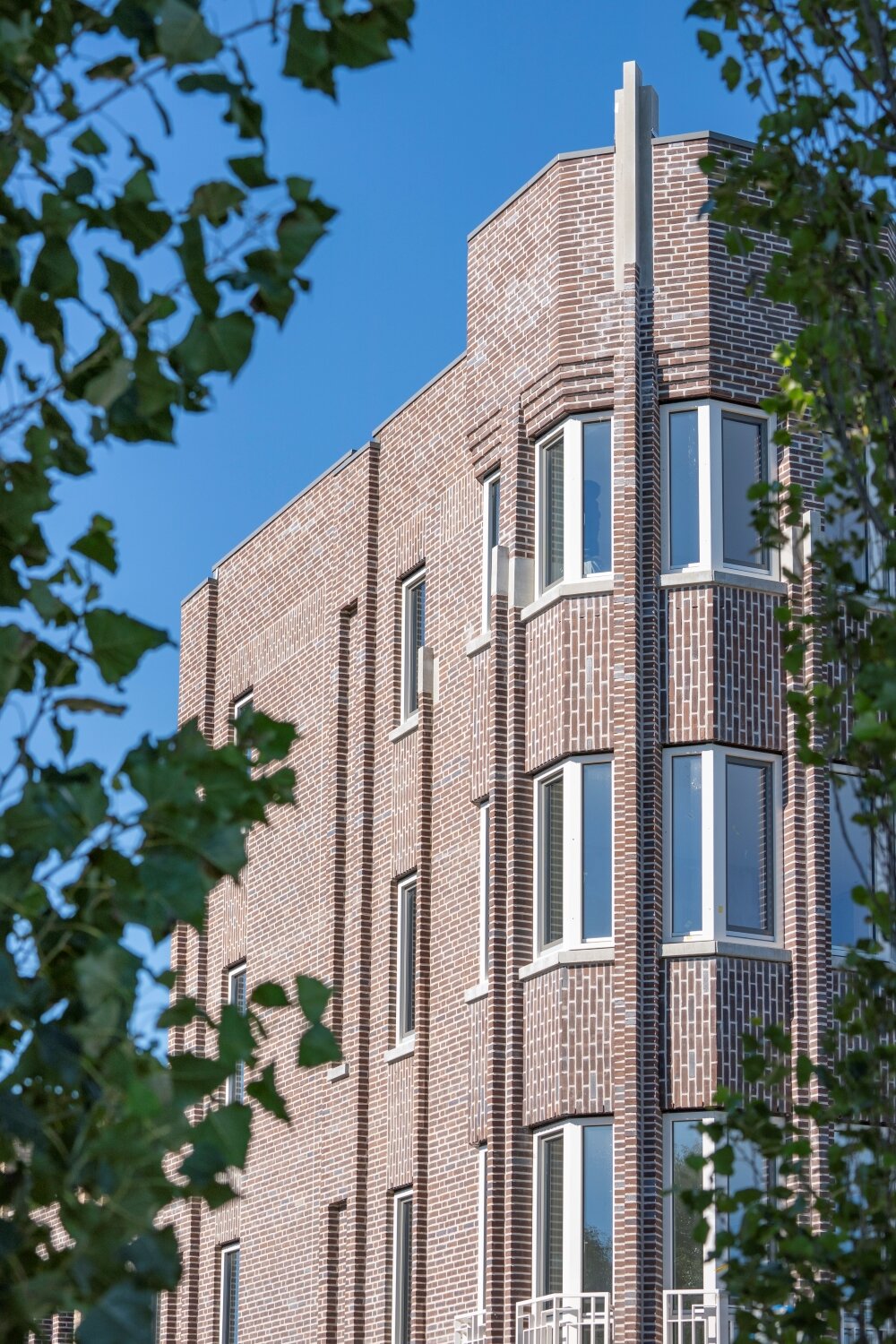 “Door in blokjes te denken, ontstaan in het gevelaanzicht ‘pandjes’”, vult Bert aan. “We hebben steeds een paar huizen naast elkaar dezelfde vormtaal en materialisatie gegeven en dat afgewisseld. Dat geeft het geheel een expressieve architectuur met meer dynamiek. Het wordt dan minder plat. De betonnen bandjes, de manier van metselen, geometrische figuren en overdadige versieringen verwijzen naar de art-deco stijl die in het beeldkwaliteitsplan werd voorgeschreven. Dat heeft heel goed uitgepakt.”