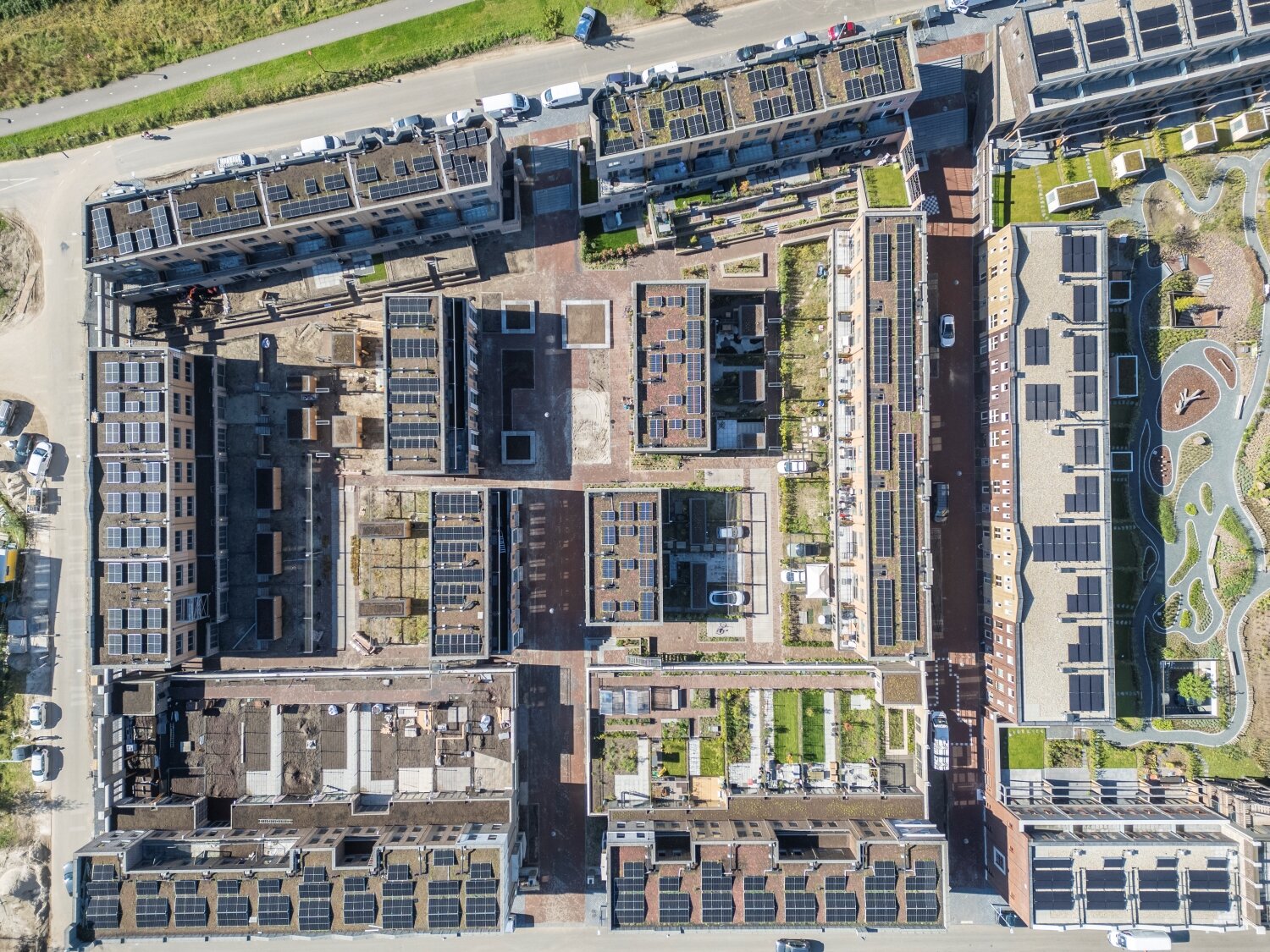 “Je ervaart niet dat we hier met een hoge dichtheid van 100 woningen per hectare hebben gewerkt. Terwijl dit toch echt twee tot drie keer zoveel is dan bij de meeste andere nieuwbouwprojecten. Auto’s zijn zonder ondergrondse parkeerkelder onder de woningen weggewerkt en het hele binnengebied met pergola’s, daktuinen en zitjes is mee ontworpen. Je ziet aan de buitenkant niet dat dit buurtje een mix van betaalbare woningen en vrije sector woningen heeft. Dat is niet te zien in het ontwerp. Het ensemble van woningen voelt aan als één geheel. Aan de buitenzijde robuust met bakstenen art-deco gevels en van binnen wat zachter met groen en natuurlijke materialen als Resysta gevelbekleding. Dat is een soort rijstvlies met de look and feel van hout, maar dan heel maatvast, onderhoudsvrij én biobased.”