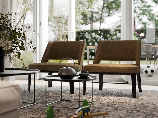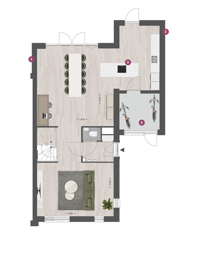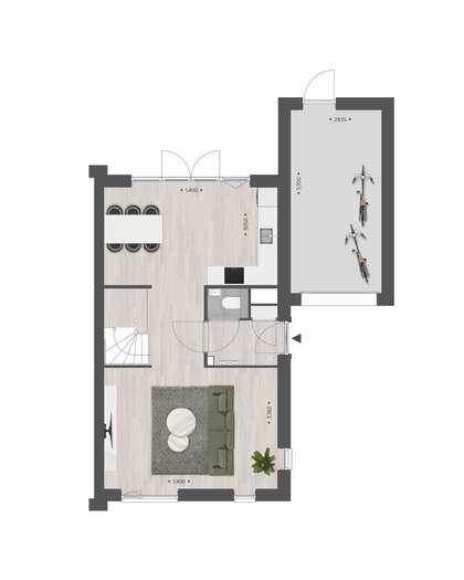 De indeling is bijzonder praktisch met beneden een hal met toilet en garderobe. Het woongedeelte bevindt zich aan de voorzijde, het eetgedeelte met keuken aan de achterzijde. De vertrekken worden van elkaar gescheiden door de hal en de trapopgang. De begane grond kan vergroot worden met 1.20 of 2.40 meter waarbij de keuken naar de voorzijde verplaatst kan worden. Met de optie om de garage te verlengen en/of te splitsen in een berging en een ruimte bij de woning te betrekken, creĆ«er je extra veel leefruimte op de begane grond.Ā