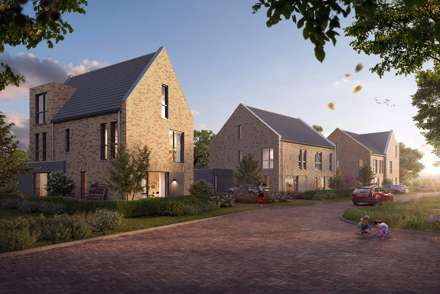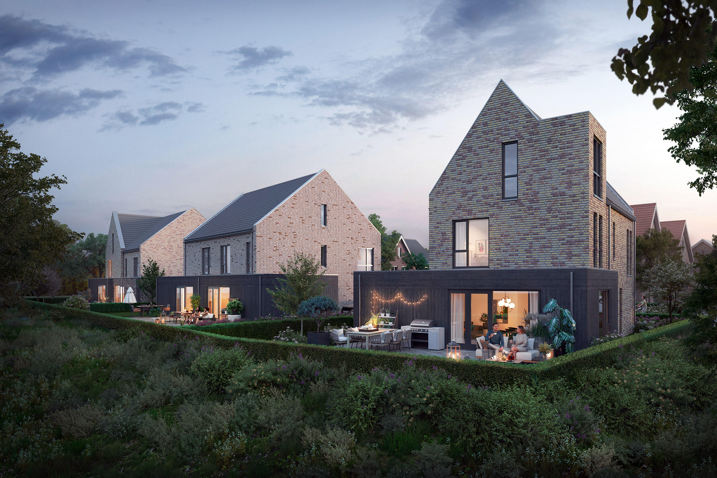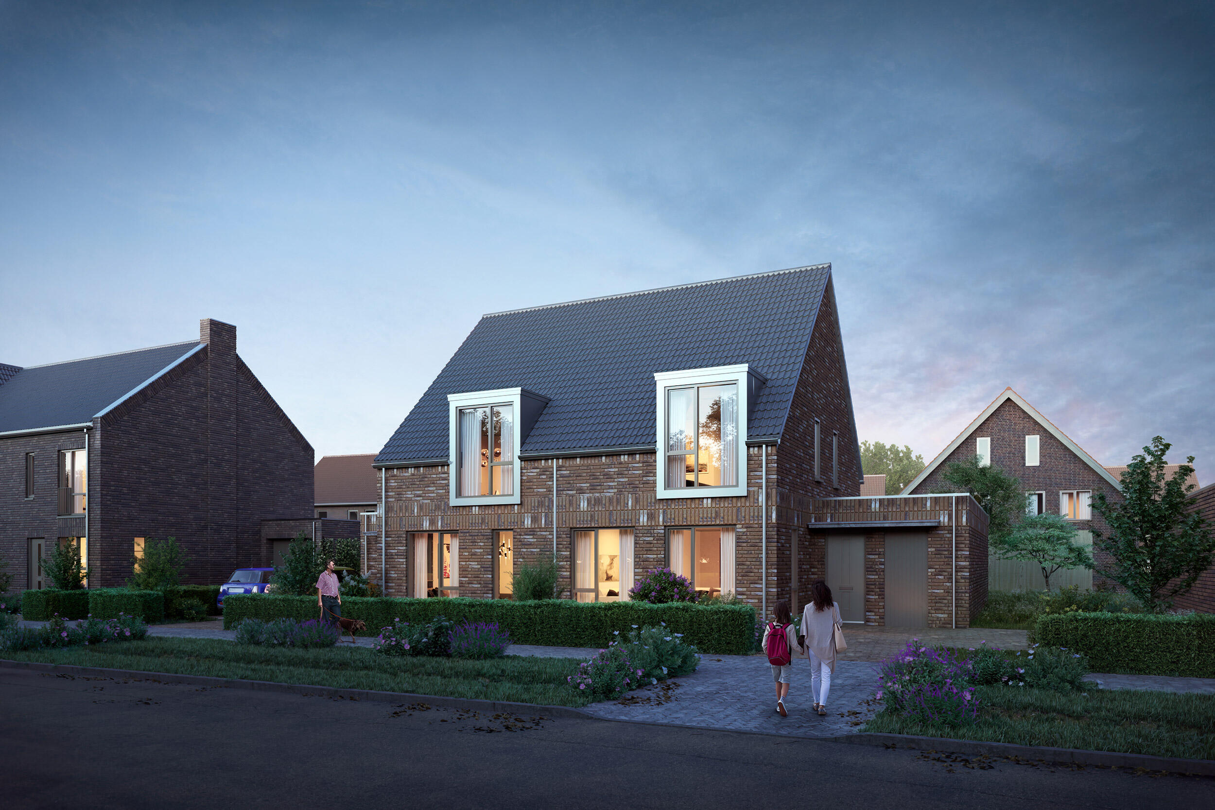 Zo zorgen we voor een dorpse zachtheid. Het Erf, in het midden van het plan, heeft een heel eigen sfeer door de afwijkende tint metselwerk en dakpannen. En tot slot is er dan nog de zone die we tijdens de planontwikkeling ‘de Wildernis’ noemden. De inrichting hiervan is geïnspireerd op woeste natuur. Het moet een groene loper worden die dwars door de wijk loopt. De woningen hebben er een net wat eigenwijzere architectuur en achtertuinen die overlopen in het groengebied.”