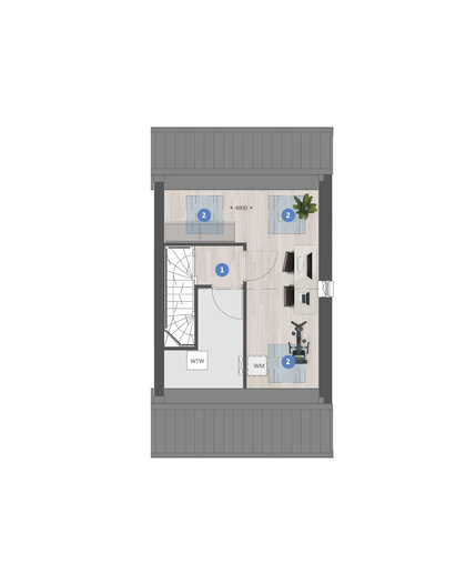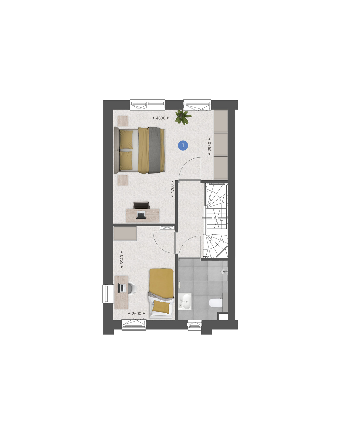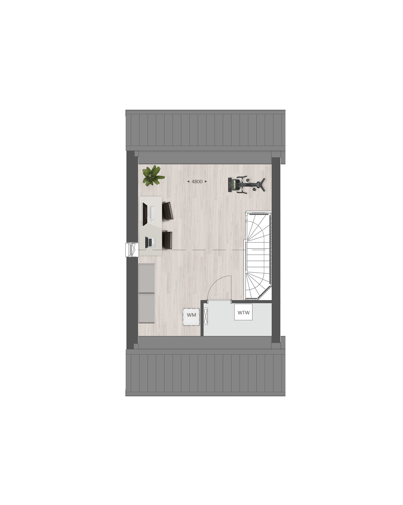 De tweede verdieping biedt je een zee aan ruimte. Hier vind je de aansluitingen voor de wasapparatuur en heb je de mogelijkheid om een aparte wasruimte te maken en een thuiskantoor of extra slaapkamer met dakkapel aan de voor- Ʃn/of achterzijde.