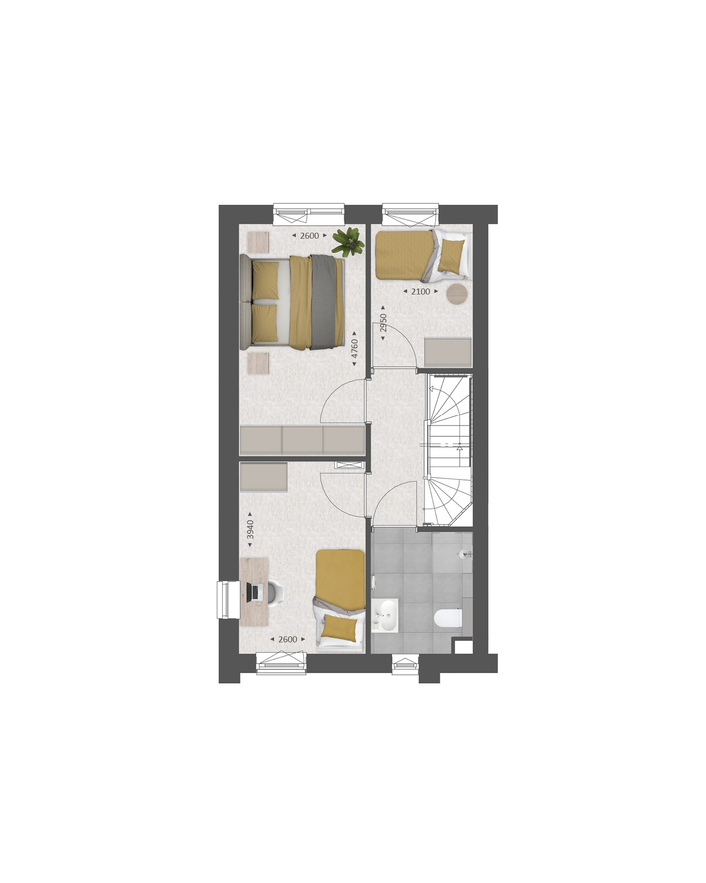 Op de verdieping vind je drie slaapkamers en een complete badkamer met douche, wastafel en 2e toilet. Wil je een ligbad? Dat kan! Vergroot de badkamer voor meer ruimte. Je kunt bijvoorbeeld ook de 2 slaapkamers aan de achterzijde samenvoegen tot ƩƩn grote hoofdslaapkamer.