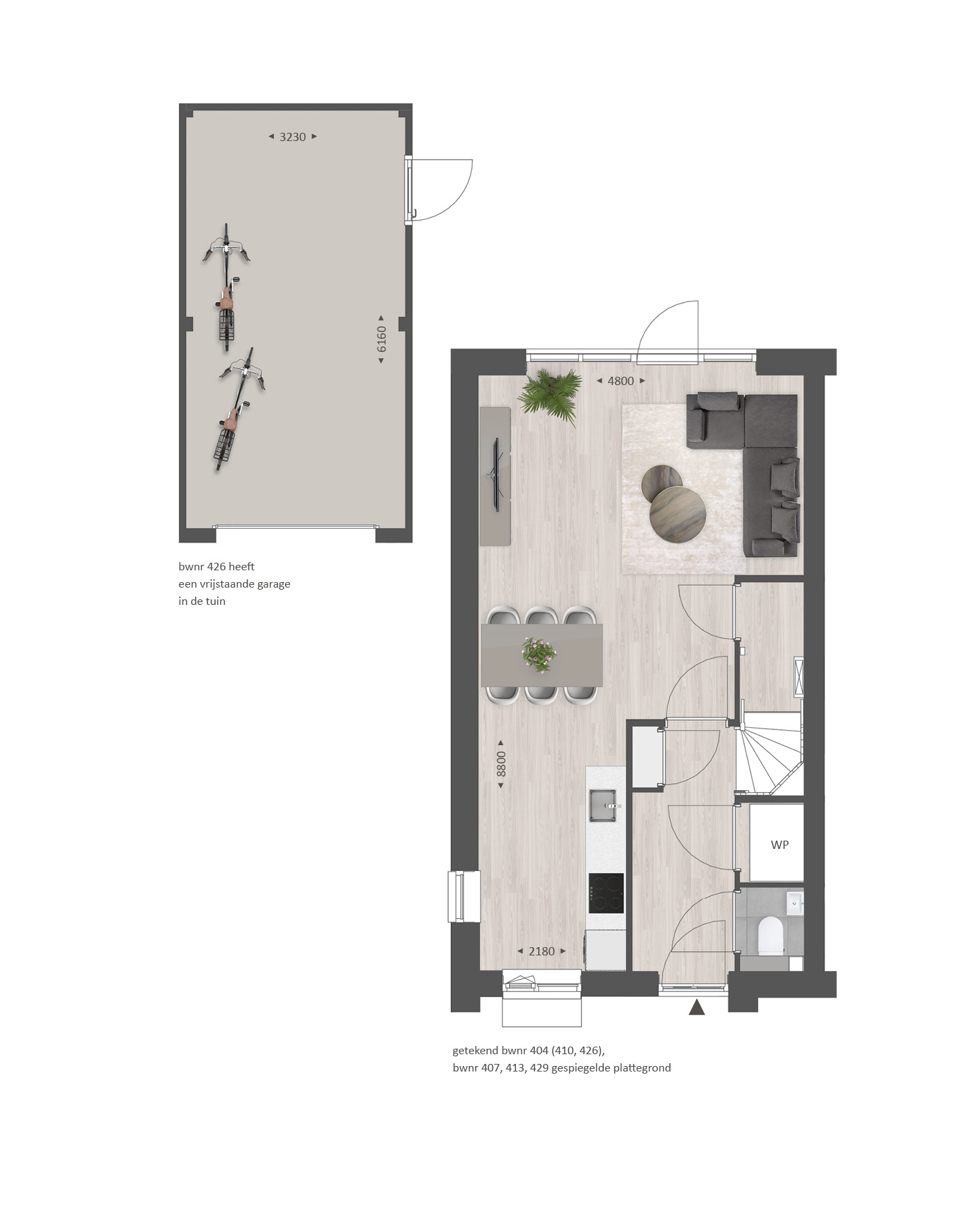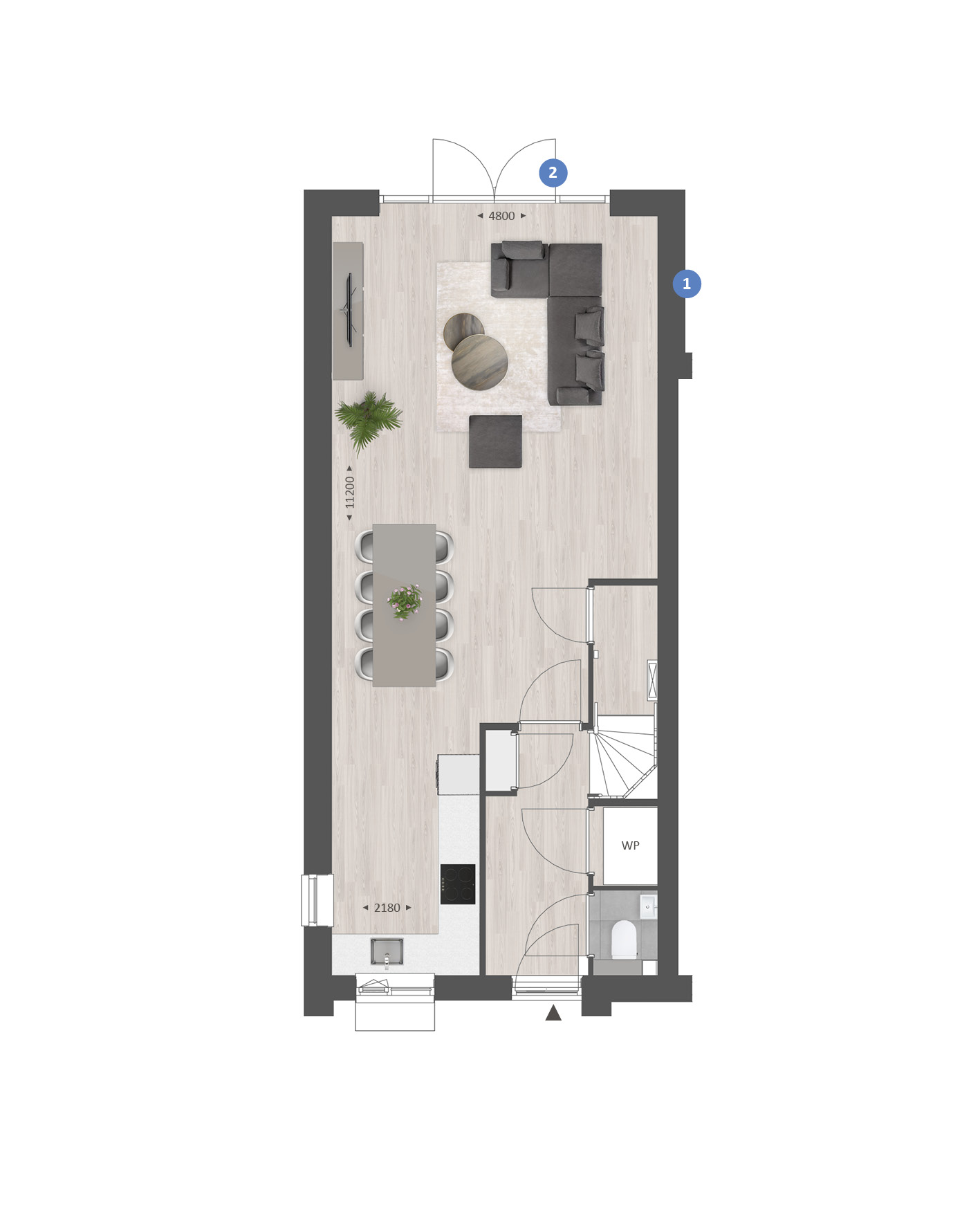 De indeling is bijzonder praktisch met beneden een hal met toilet en technische ruimte, een lichte tuingerichte woonkamer en een open keuken met zicht op de straat. TIP: Maak de woonkamer nóg groter met de optie om deze met 1.20m of 2.40m uit te breiden. De optie voor openslaande tuindeuren zorgen voor veel contact met de achtertuin.
