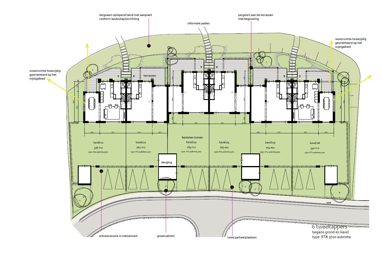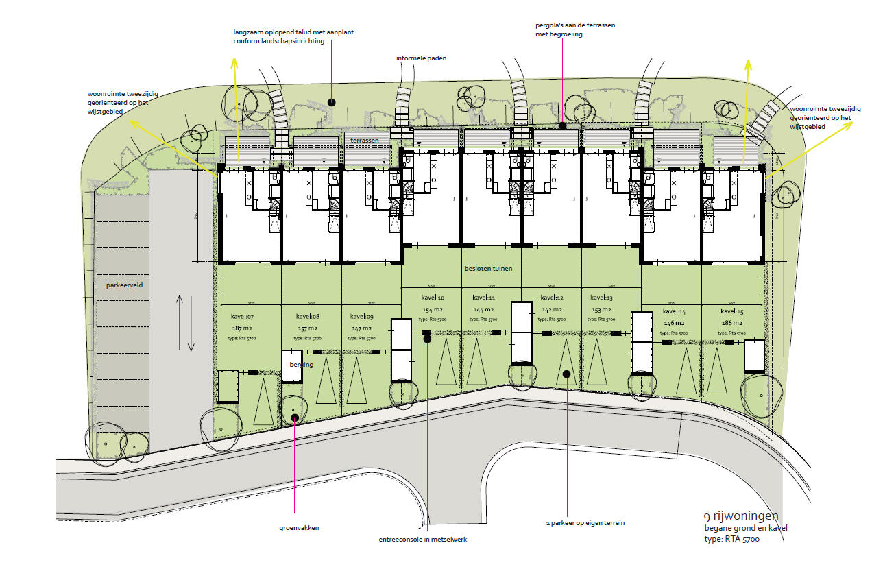 De 15 parkwoningen zijn onderverdeeld in 6 tweekappers en 9 rijwoningen. Waarvan de voorgevels gesitueerd zijn op een prachtige, zorgvuldig vormgegeven groene parkzone. De op het westen georiënteerde terrassen/tuinen aan de voorzijde van de woningen, liggen op een fraai, groen talud. Hierdoor heb je een uniek uitzicht over het park en tegelijkertijd wordt je privacy gewaarborgd door de begroeiing op het talud. Daarnaast beschik je ook nog over een royale privé achtertuin met ruimte voor minimaal 1 parkeerplaats op eigen terrein.