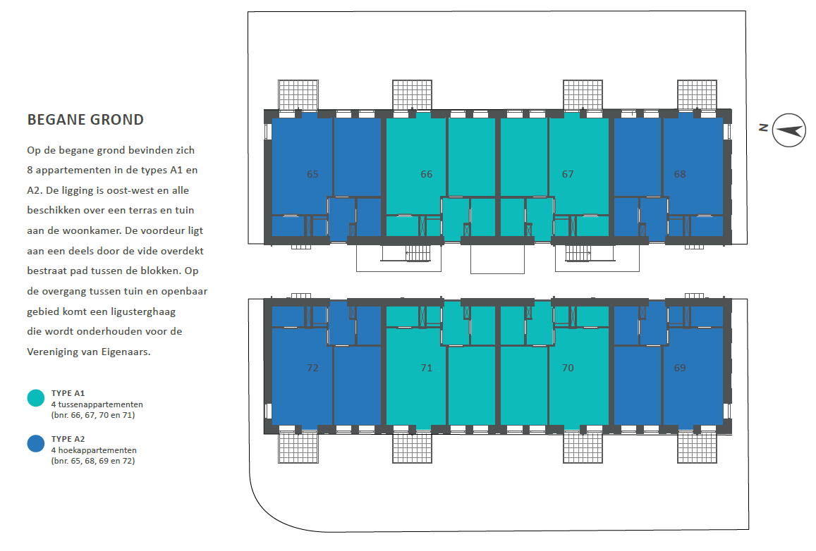 Op de begane grond bevinden zich 8 appartementen in de types A1 en A2. De ligging is oost-west en alle beschikken over een terras en tuin aan de woonkamer. De voordeur ligt aan een deels door de vide overdekt bestraat pad tussen de blokken. Op de overgang tussen tuin en openbaar gebied komt een ligusterghaag die wordt onderhouden voor de Vereniging van Eigenaars.