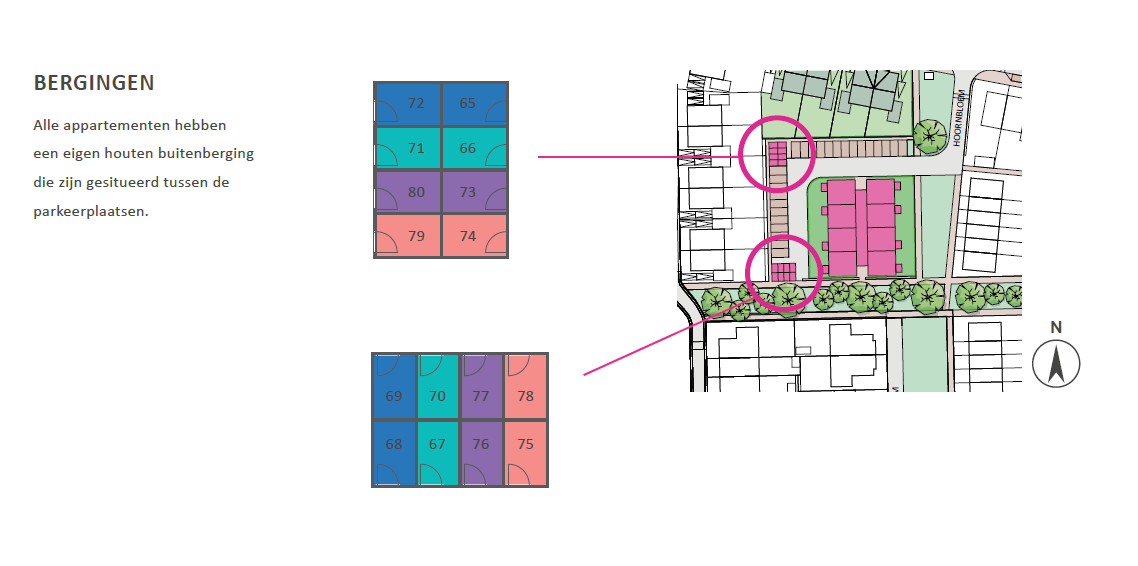 Alle appartementen hebben een eigen houten buitenberging die zijn gesitueerd tussen de parkeerplaatsen.