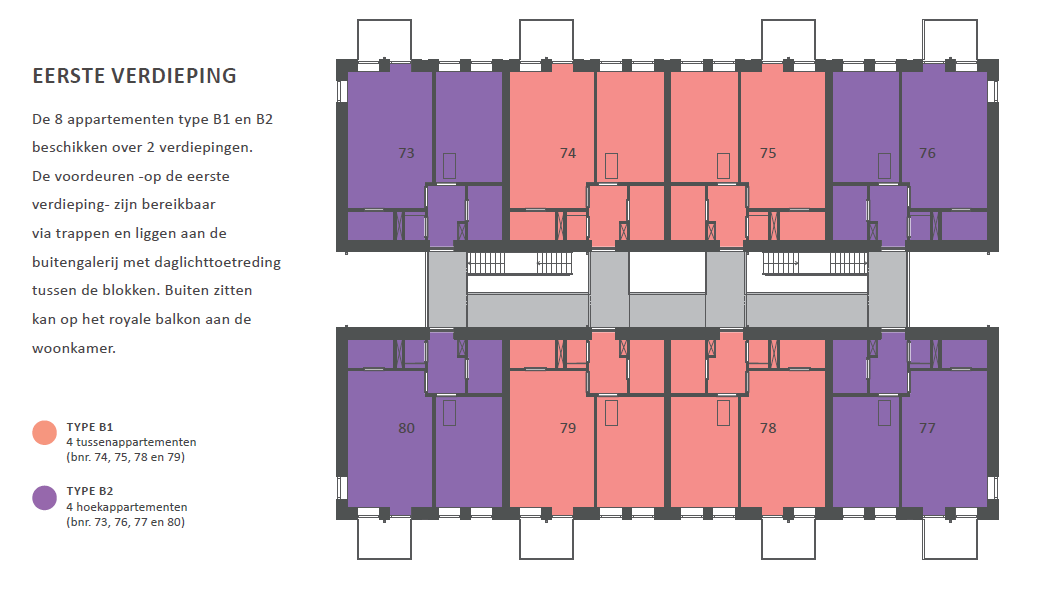 De 8 appartementen type B1 en B2 beschikken over 2 verdiepingen. De voordeuren -op de eerste verdieping- zijn bereikbaar via trappen en liggen aan de buitengalerij met daglichttoetreding tussen de blokken. Buiten zitten kan op het royale balkon aan de woonkamer.