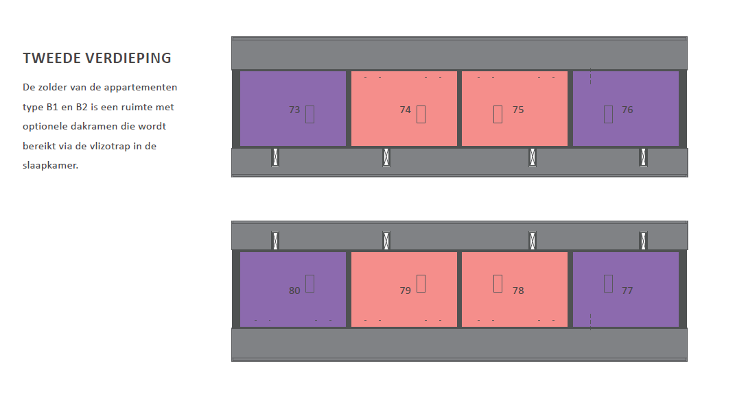 De zolder van de appartementen type B1 en B2 is een ruimte met optionele dakramen die wordt bereikt via de vlizotrap in de slaapkamer.