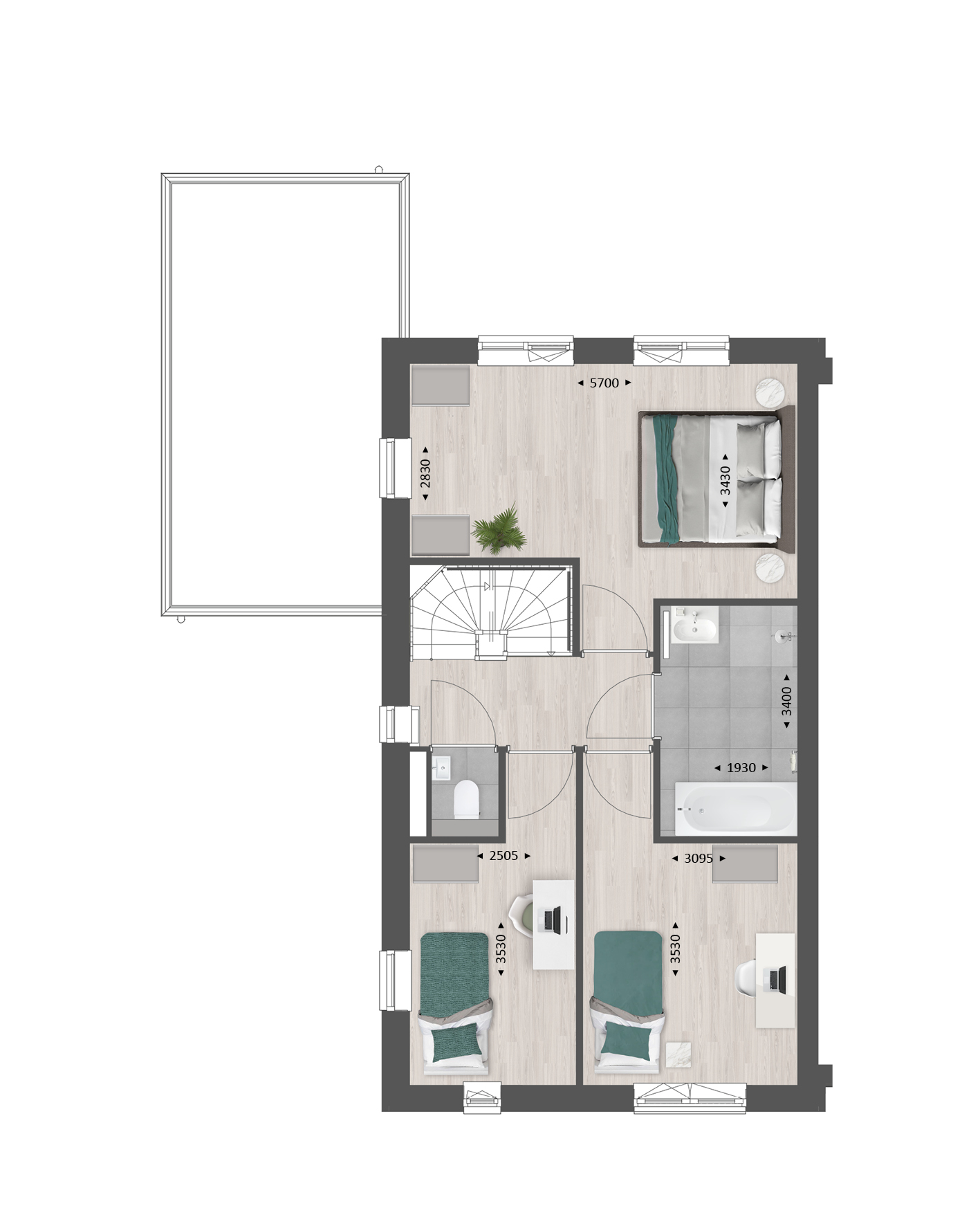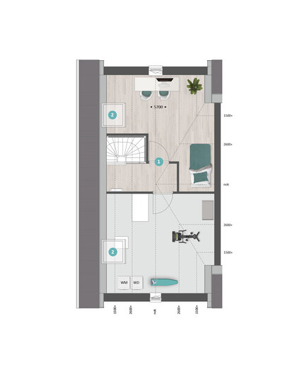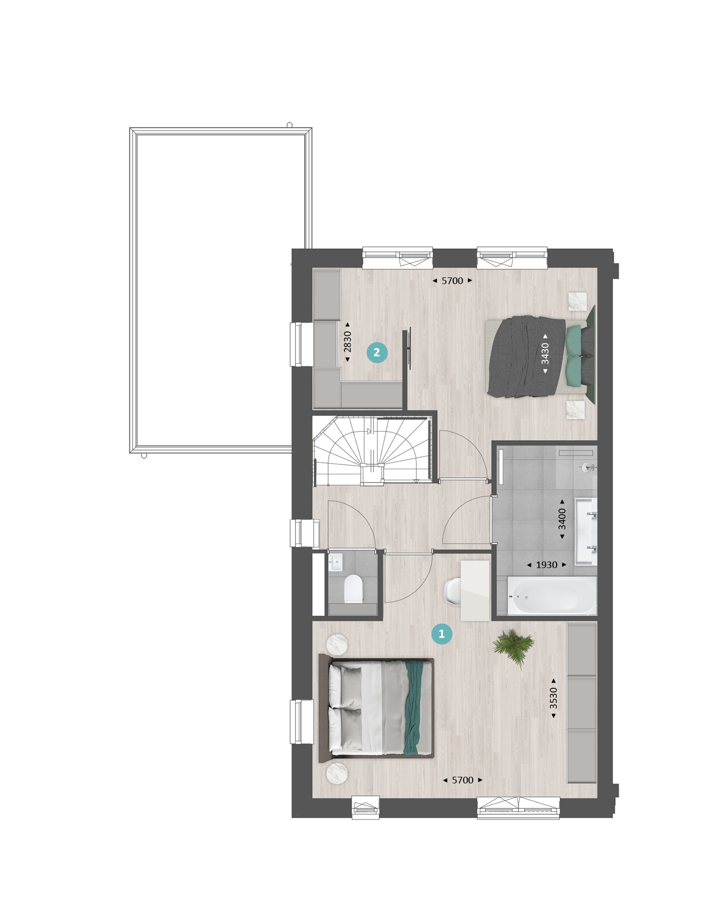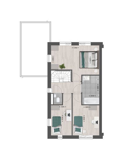 De tweede verdieping is ruim van opzet. Met een combinatie van diverse indelingsopties maak je hier een prachtige woonverdieping met bijvoorbeeld twee slaapkamers, een tweede badkamer en een was-/bergruimte.