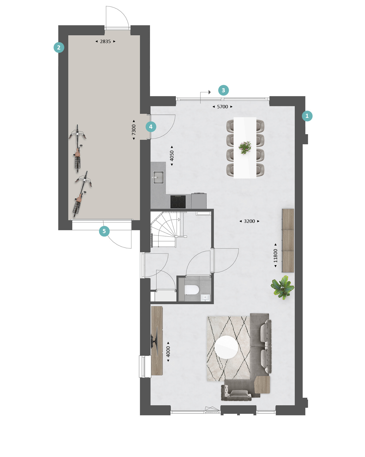De indeling is bijzonder praktisch met beneden een hal met toilet en garderobe, een lichte L-vormige woonkamer, een open keuken met ruime eethoek. De begane grond kan vergroot worden met een uitbouw van 1.20 of 2.40 meter, waarbij de keuken eventueel naar de voorzijde verplaatst kan worden. Met de optie om de garage te verlengen en/of te splitsen in een berging en een ruimte bij de woning te betrekken, creëer je extra veel leefruimte op de begane grond.