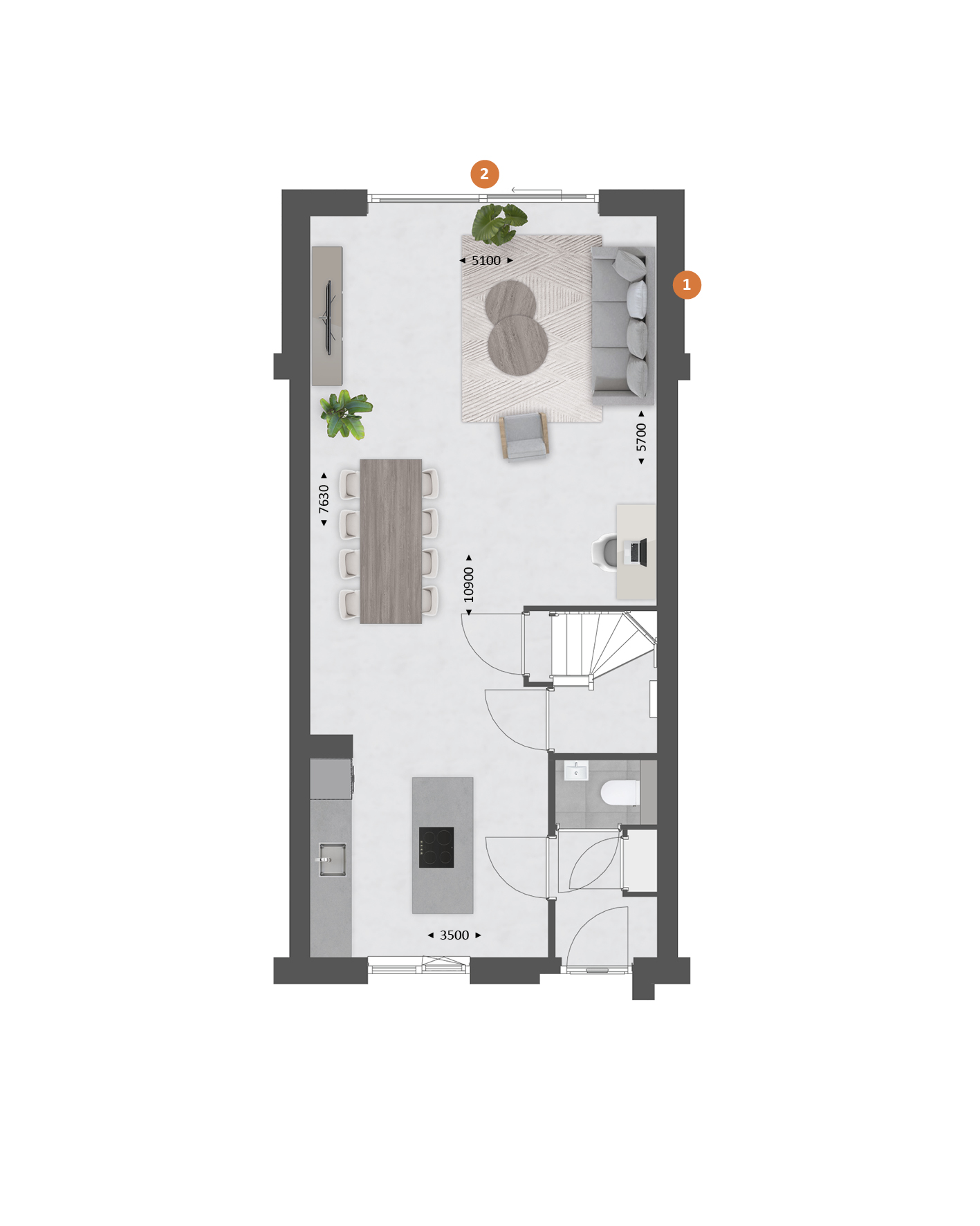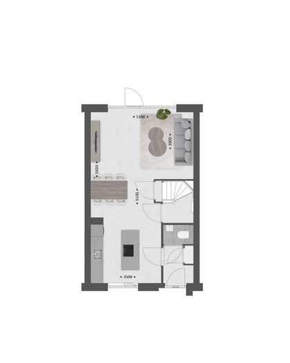 De indeling is bijzonder praktisch met beneden een compacte hal met toilet, een lichte tuingerichte woonkamer en een open keuken met zicht op de straat. TIP: Maak de woonkamer nóg groter met de optie om deze met 1.20m of 2.40m uit te breiden. Of verplaats de keuken naar het midden van de woning of naar de achterzijde om een extra grote leefkeuken te creëren. De optie voor openslaande tuindeuren zorgen voor veel contact met de achtertuin.