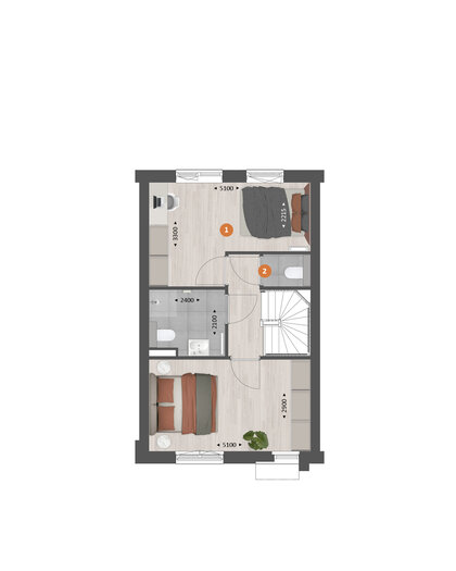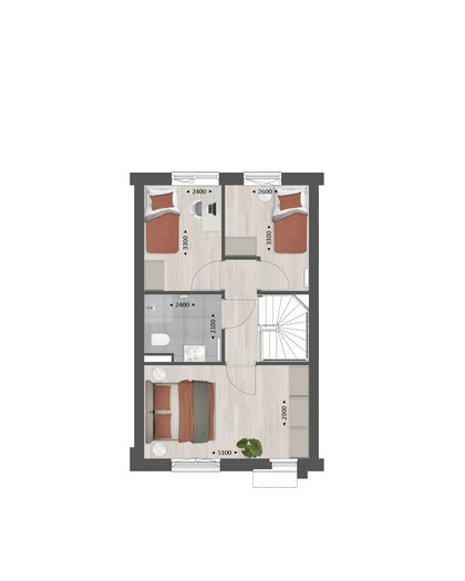 Op de verdieping vind je drie slaapkamers (waarvan 1 over de volledige breedte van het huis) en een complete badkamer met douche, wastafel en 2e toilet. Wil je een ligbad? Dat kan! Creëer meer ruimte in de badkamer door te kiezen voor een apart toilet op deze verdieping. Je kunt bijvoorbeeld ook de 2 slaapkamers aan de achterzijde samenvoegen tot één grote hoofdslaapkamer.