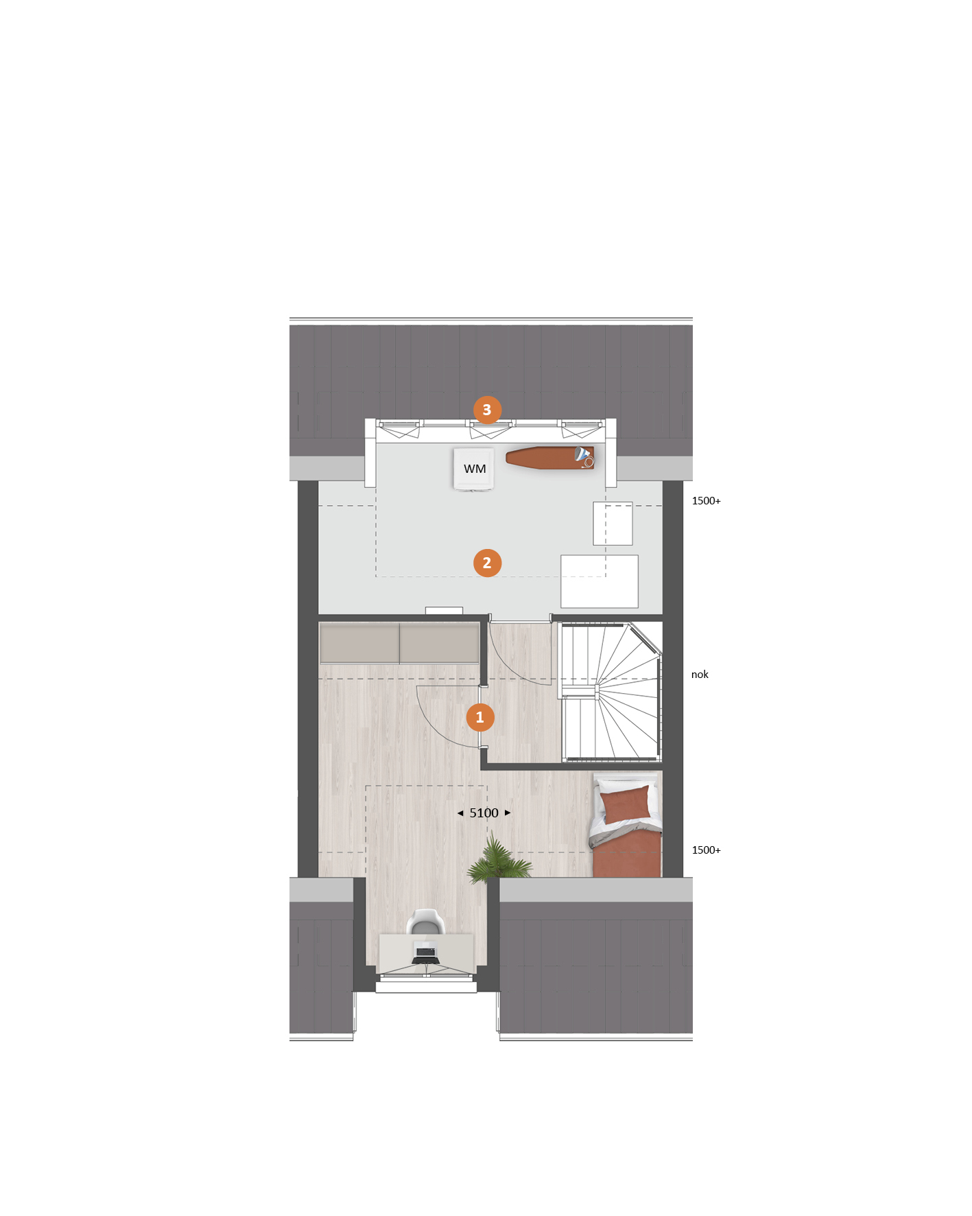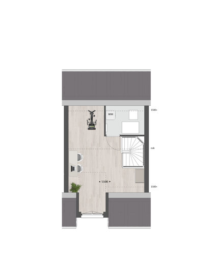 De tweede verdieping biedt je een zee aan ruimte. Hier vind je de aansluitingen voor de wasapparatuur en heb je de mogelijkheid om een aparte wasruimte te maken en een thuiskantoor of extra slaapkamer met dakkapel aan de voor- én/of achterzijde.