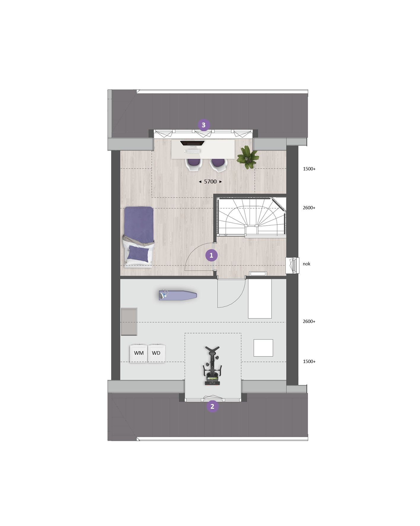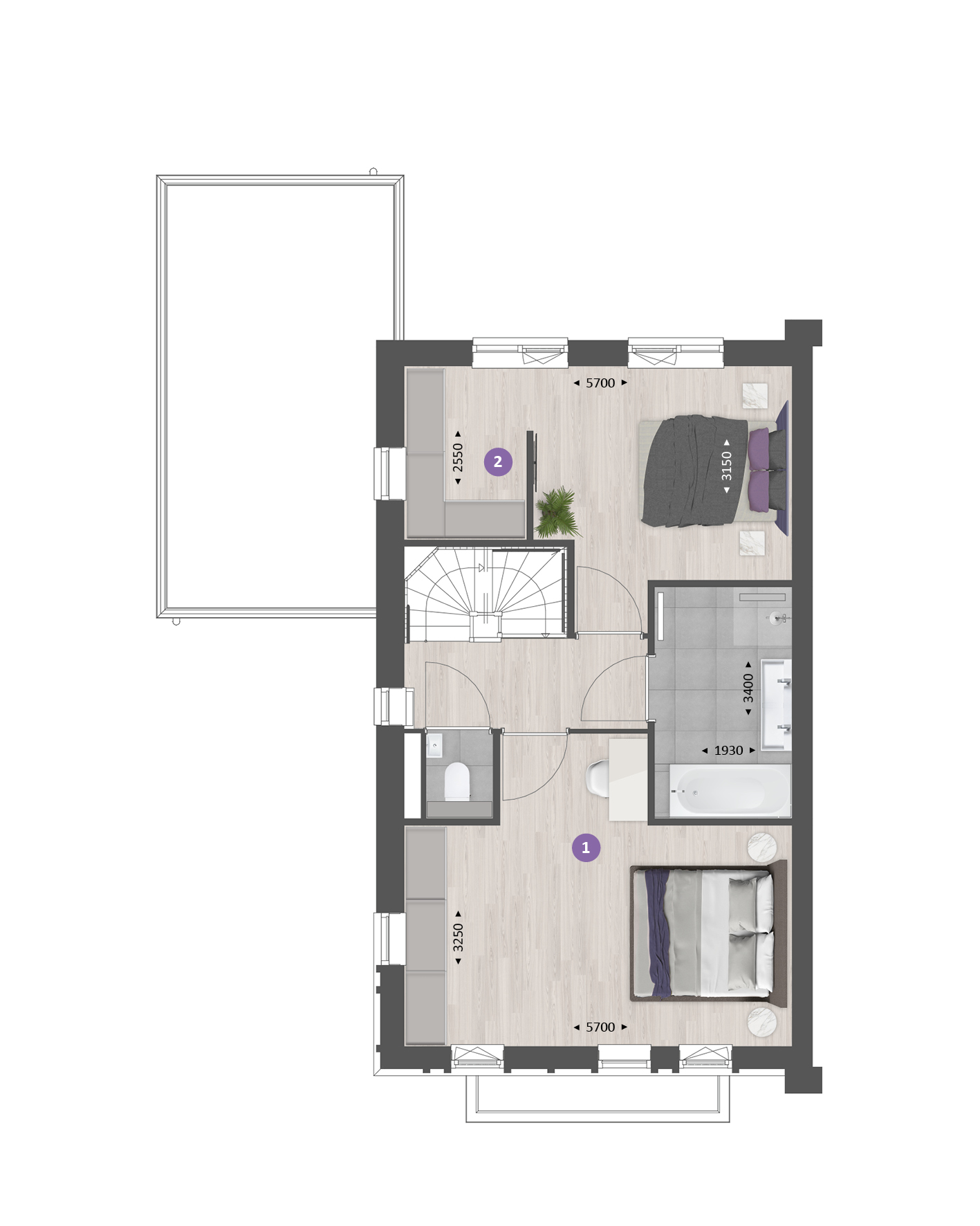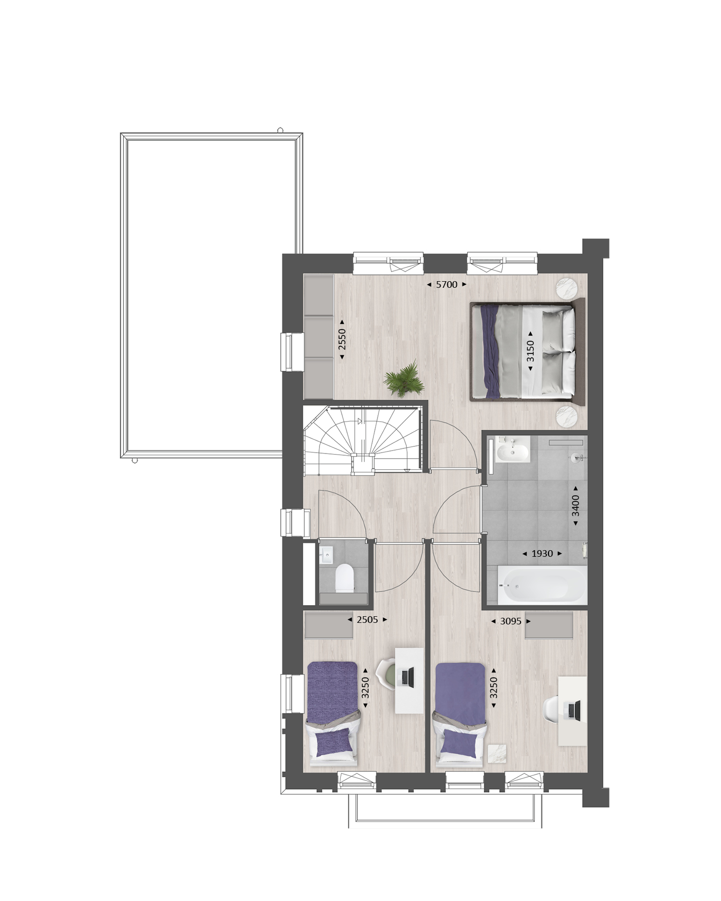 Ook de verdiepingen zijn naar wens in te delen. Op de eerste verdieping kun je de badkamer vergroten voor meer comfort, of twee slaapkamers samenvoegen tot één royale hoofdslaapkamer met bijv. een inloopkast. Op de tweede verdieping richt je met diverse indelingsopties een volwaardige woonlaag in, met bijvoorbeeld twee extra slaapkamers, een tweede badkamer en een praktische was-/bergruimte.