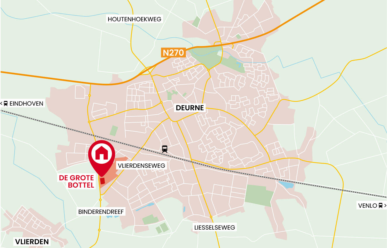 Aan de rand van Deurne met het prachtige Peelgebied als buur - tussen de Binderendreef, Vlierdenseweg, Industrieweg en De Grote Bottel - ligt het nieuwbouwproject De Grote Bottel. Hier vind je alle ruimte om heerlijk te wonen, te groeien en te genieten. En ervaar je de gezelligheid van een dorp én het gemak van de grote stad. Binnen 20 minuten sta je in Eindhoven, midden in Brainport – dé innovatieve regio van Nederland, met alle voordelen van werk, kennis en faciliteiten. Thuis geniet je van rust en natuur. Kortom het beste van twee werelden!