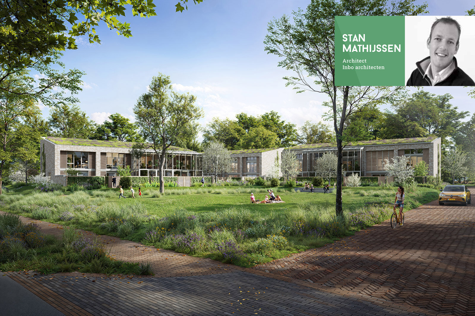 Doordat landschap en architectuur in dit ontwerp in elkaar overgaan, hebben we samen met de landschapsarchitect een integraal ontwerp gemaakt. Mensen en dieren ontmoeten elkaar in de collectieve bloementuin die overgaat in de privétuinen. De groene daken bufferen het regenwater uit flinke hoosbuien en bieden extra verkoeling van de woningen.