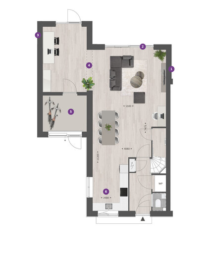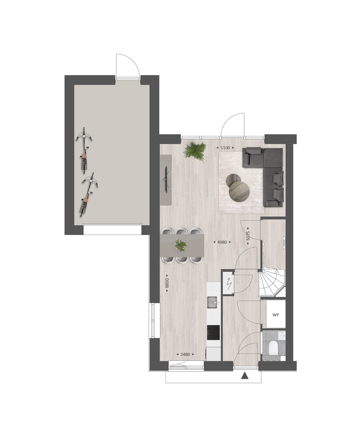 De indeling is bijzonder praktisch met beneden een hal met toilet en technische ruimte, een lichte tuingerichte woonkamer en een open keuken met zicht op de straat. TIP: Maak de woonkamer nóg groter met de optie om deze met 1.20m of 2.40m uit te breiden. De optie voor openslaande tuindeuren zorgen voor veel contact met de achtertuin.