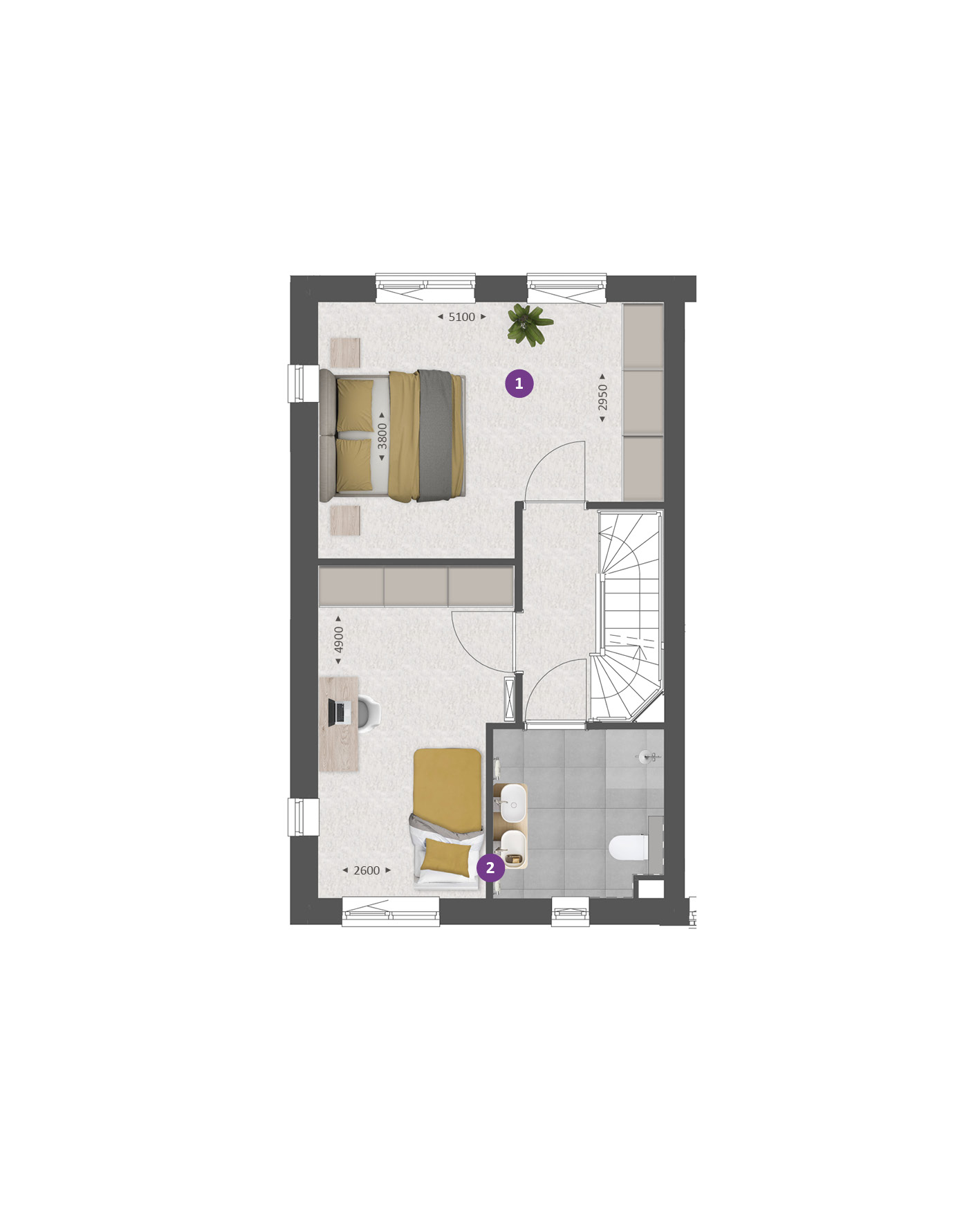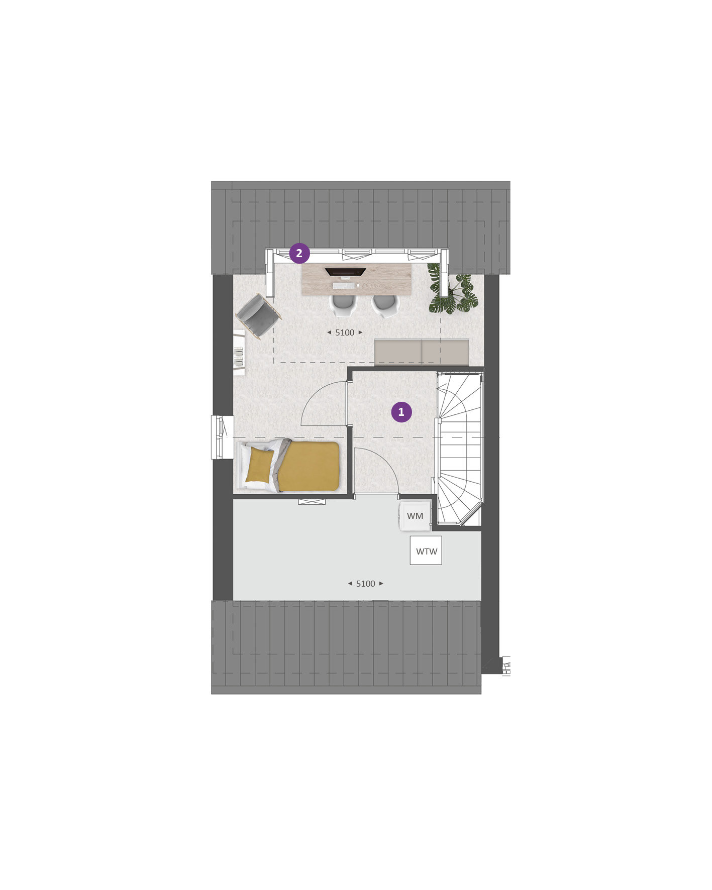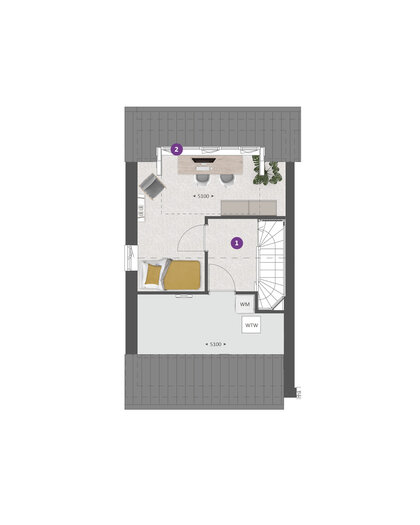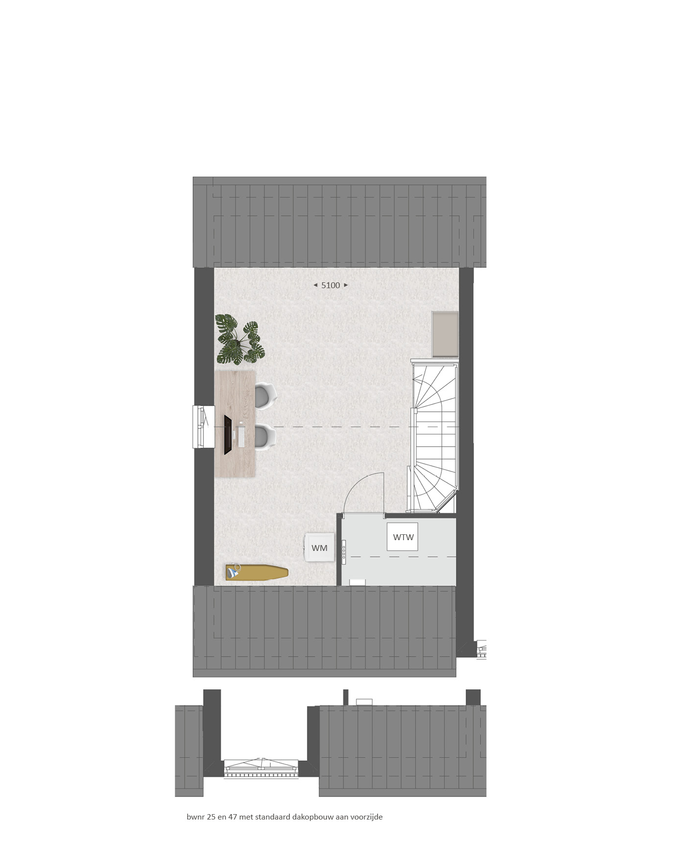 De tweede verdieping biedt je een zee aan ruimte. Hier vind je de aansluitingen voor de wasapparatuur en heb je de mogelijkheid om een aparte wasruimte te maken en een thuiskantoor of extra slaapkamer met dakkapel aan de voor- Ʃn/of achterzijde.