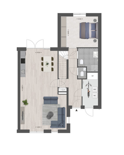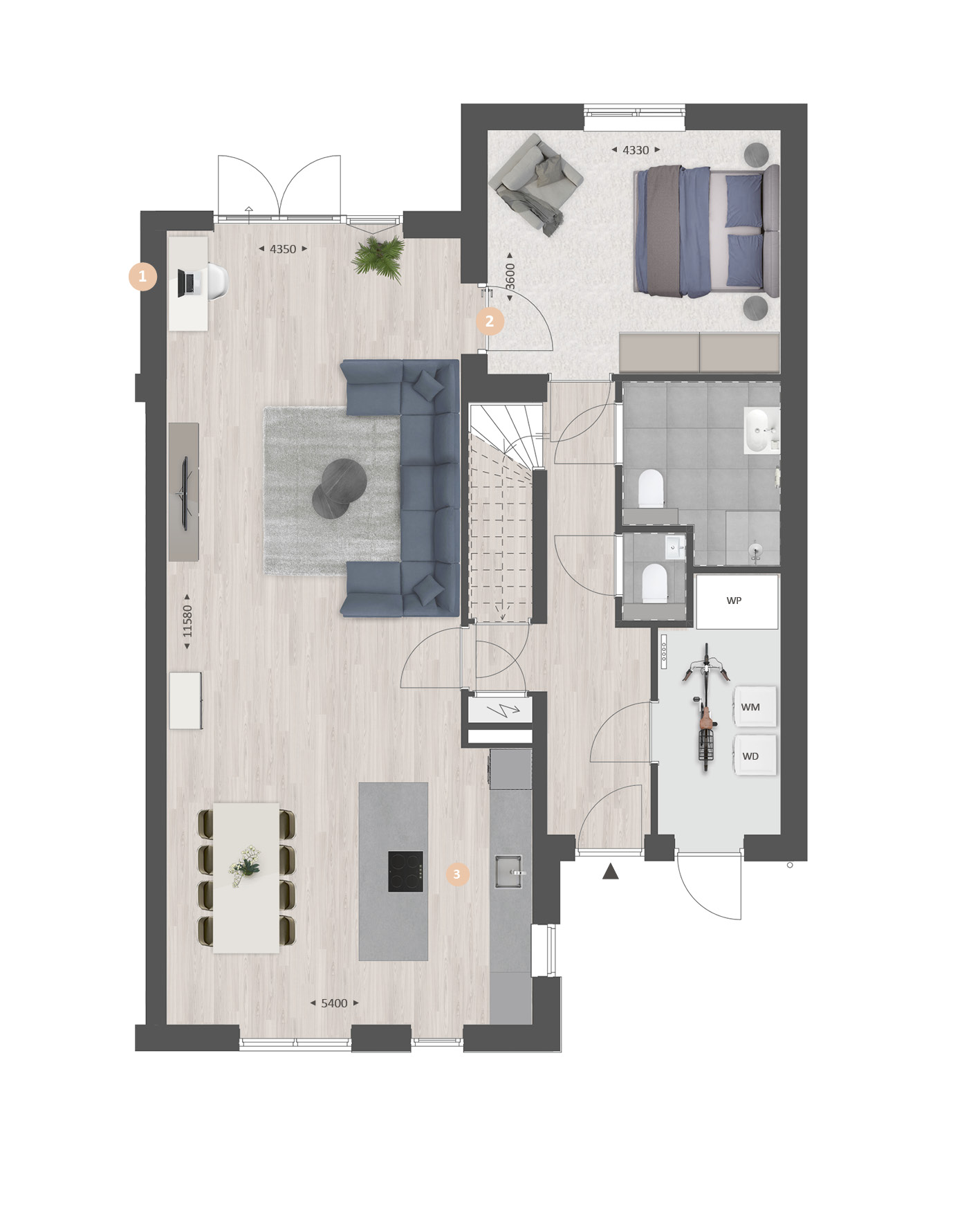 Met de diverse opties die we aanbieden kun je bijvoorbeeld de keuken naar de voorzijde verplaatsen en de woon- en slaapkamer vergroten. Je creĆ«ert hiermee veel extra leefruimte op de begane grond. Ā