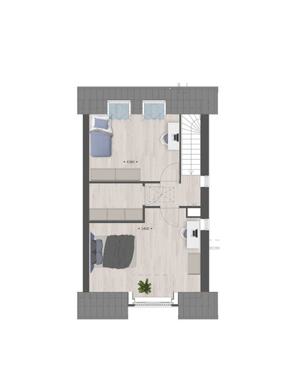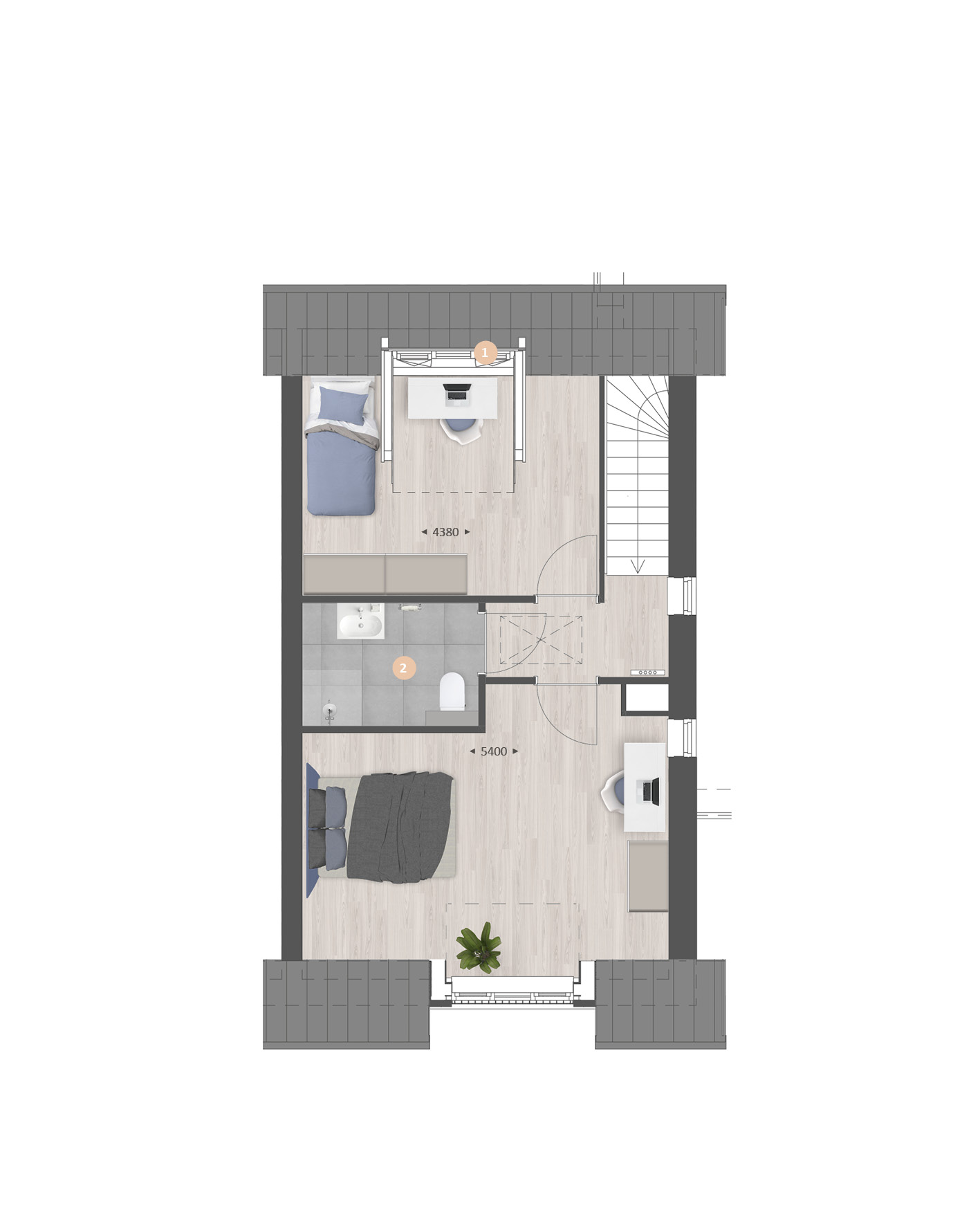 Op de verdieping vind je de overloop, twee slaapkamers en een bergruimte. Met de optie voor een dakkapel aan de achterzijde, creĆ«er je veel extra ruimte en lichtinval in de slaapkamers. In de bergruimte is het mogelijk om een 2e badkamer te maken.Ā