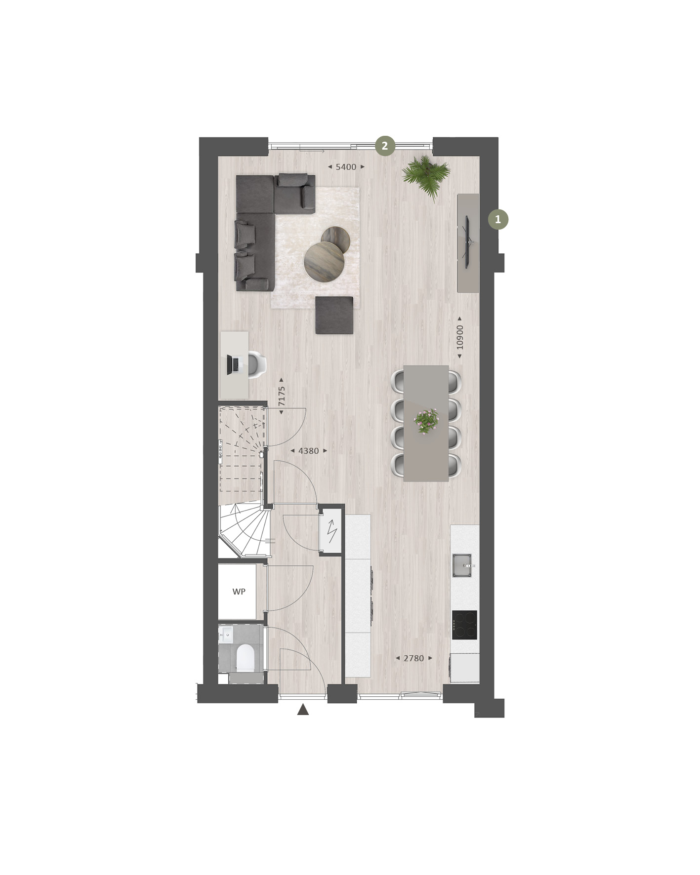 De indeling is bijzonder praktisch met beneden een hal met toilet en technische ruimte, een lichte tuingerichte woonkamer en een open keuken met zicht op de straat. TIP: Maak de woonkamer nóg groter met de optie om deze met 1.20m of 2.40m uit te breiden. De optie voor openslaande tuindeuren zorgen voor veel contact met de achtertuin.Ā Ā