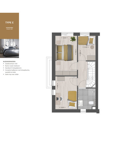 Op de verdieping vind je drie slaapkamers en een complete badkamer met douche, wastafel en 2e toilet. Wil je een ligbad? Dat kan! Vergroot de badkamer voor meer ruimte. Je kunt bijvoorbeeld ook de 2 slaapkamers aan de achterzijde samenvoegen tot ƩƩn grote hoofdslaapkamer.Ā Ā